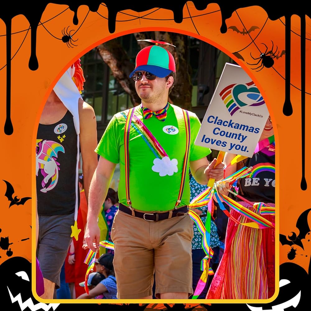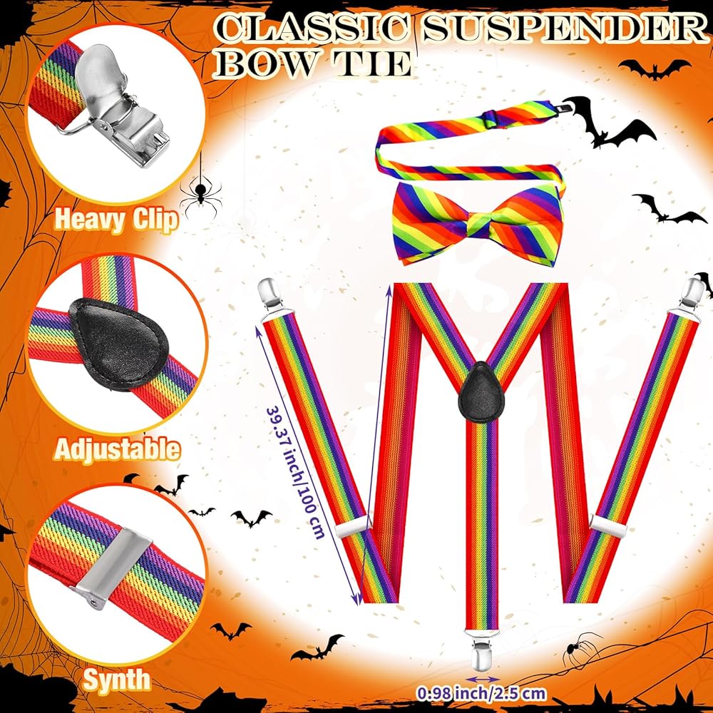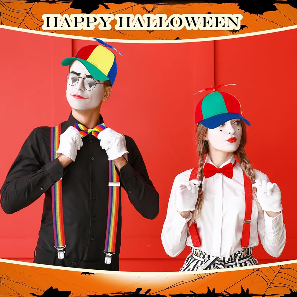 Bonuci 6 قطع زي مهرج مجموعة تشمل 2 قطعة قوس قزح المروحة قبعة للبالغين 2 قطعة Y الظهر نمط الحمالات 2 قطعة ربطة عنق هليكوبتر أعلى قبعة قابل للتعديل ربطة عنق تأثيري الطرف