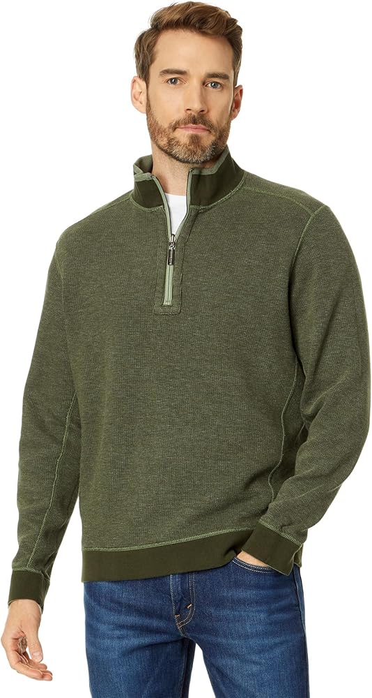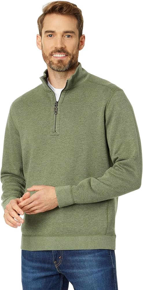 Double knit cotton/Tencel Lyocell heather interlock jacquard reversible L/S half zip pullover. Tipped rib collar/rib cuff/hem and subtle decorative stitch interest