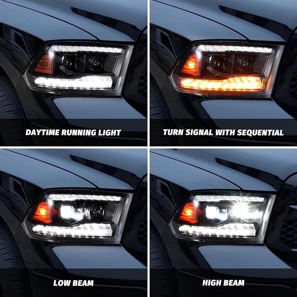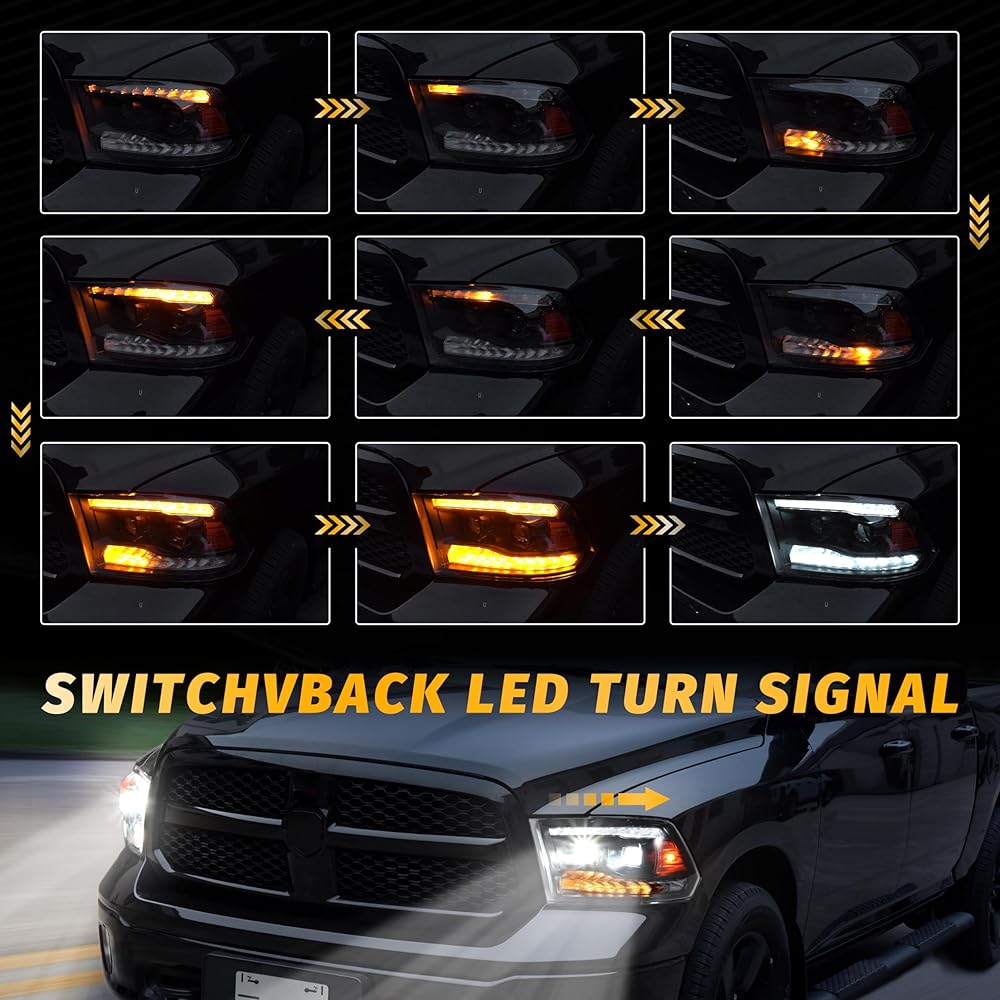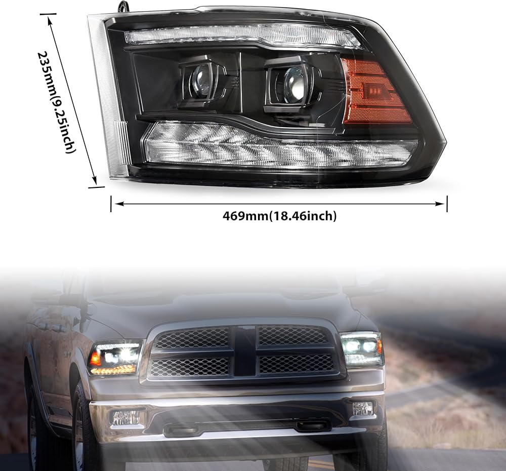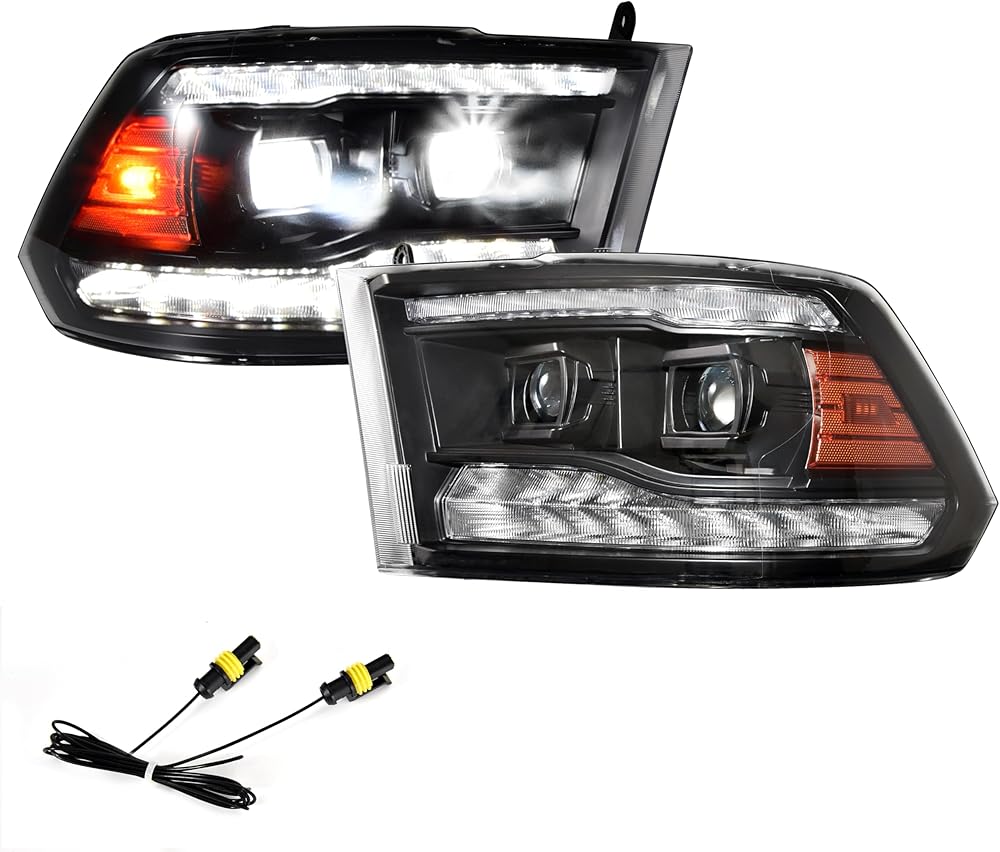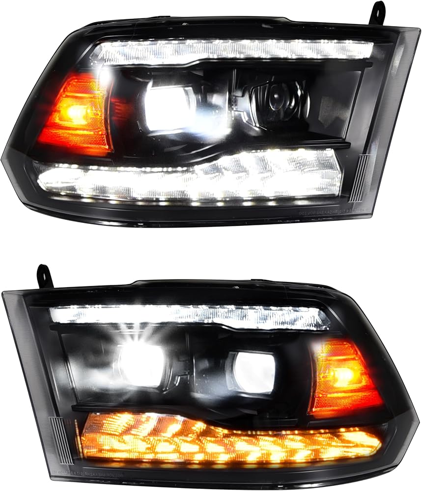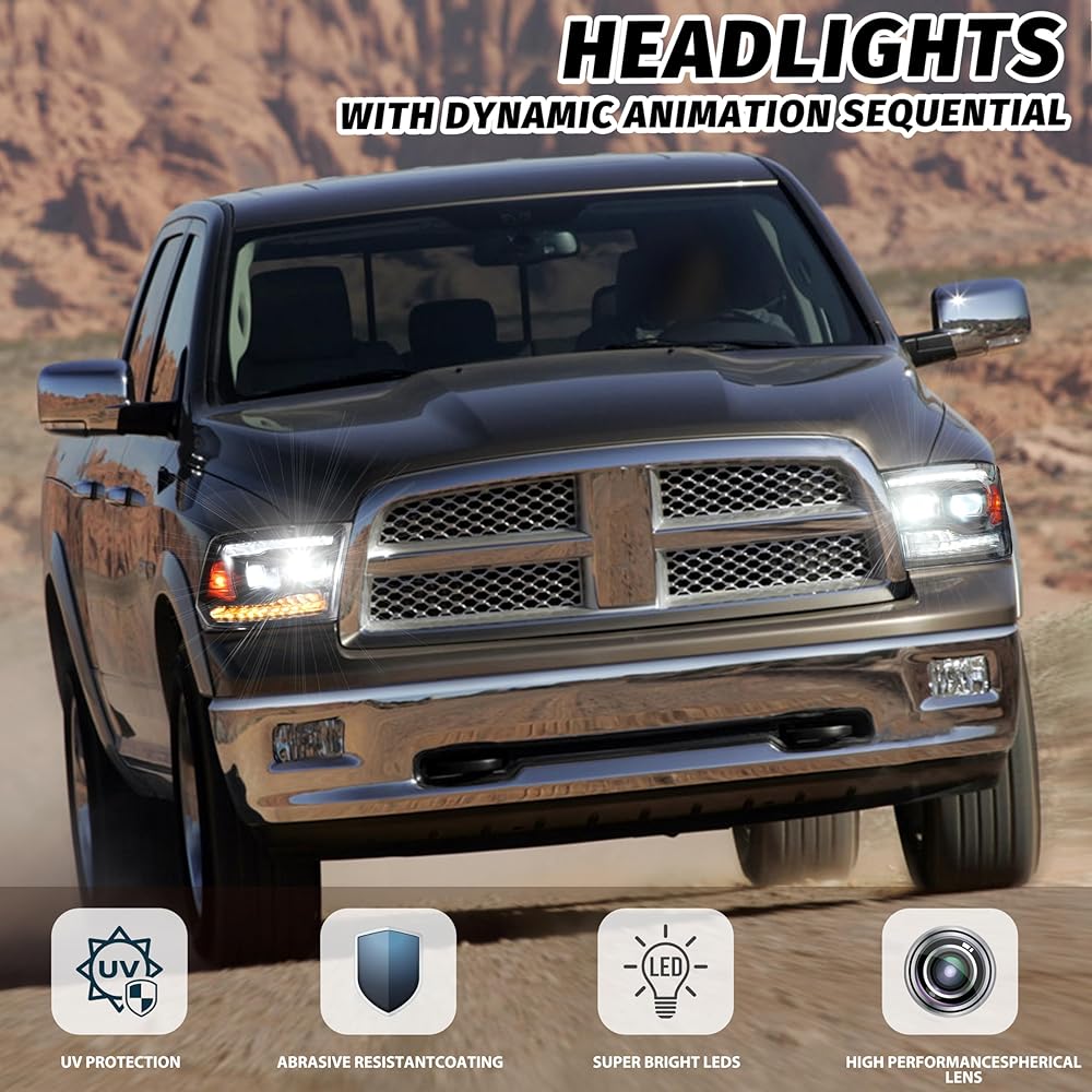 مجموعة المصابيح الأمامية لجهاز العرض LED بالكامل لعام 2009-2018 دودج رام 1500، مصابيح أمامية مزدوجة لإشارة الانعطاف التسلسلية مع شريط LED مزدوج للتحويل ل09-18 رام 1500/10-18 رام 2500/3500 (قطعتان)