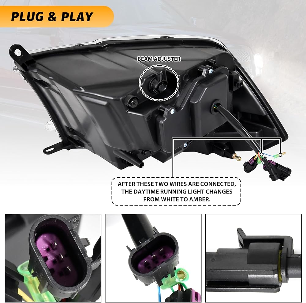 • 【وظيفية بالكامل】 تشتمل المصابيح الأمامية POKIAUTO لـ 09-18 دودج رام على مصابيح تشغيل نهارية بيضاء، وإشارات انعطاف متسلسلة، ومصابيح شعاع عالية ومنخفضة قابلة للاستبدال قابلة للاستبدال H7؛ أحدث تصميم للرسوم المتحركة لبدء التشغيل يجعل مقدمة السيارة رائعة ومبهرة؛ تتميز مصابيح إشارة الانعطاف المتسلسلة بأنها ملفتة للنظر وفريدة من نوعها، وتلبي احتياجات القيادة المختلفة. يمكن تغيير مصابيح التشغيل النهارية البيضاء إلى اللون الكهرماني (عند توصيل قابسين صغيرين أخضر اللون ببعضهما البعض)