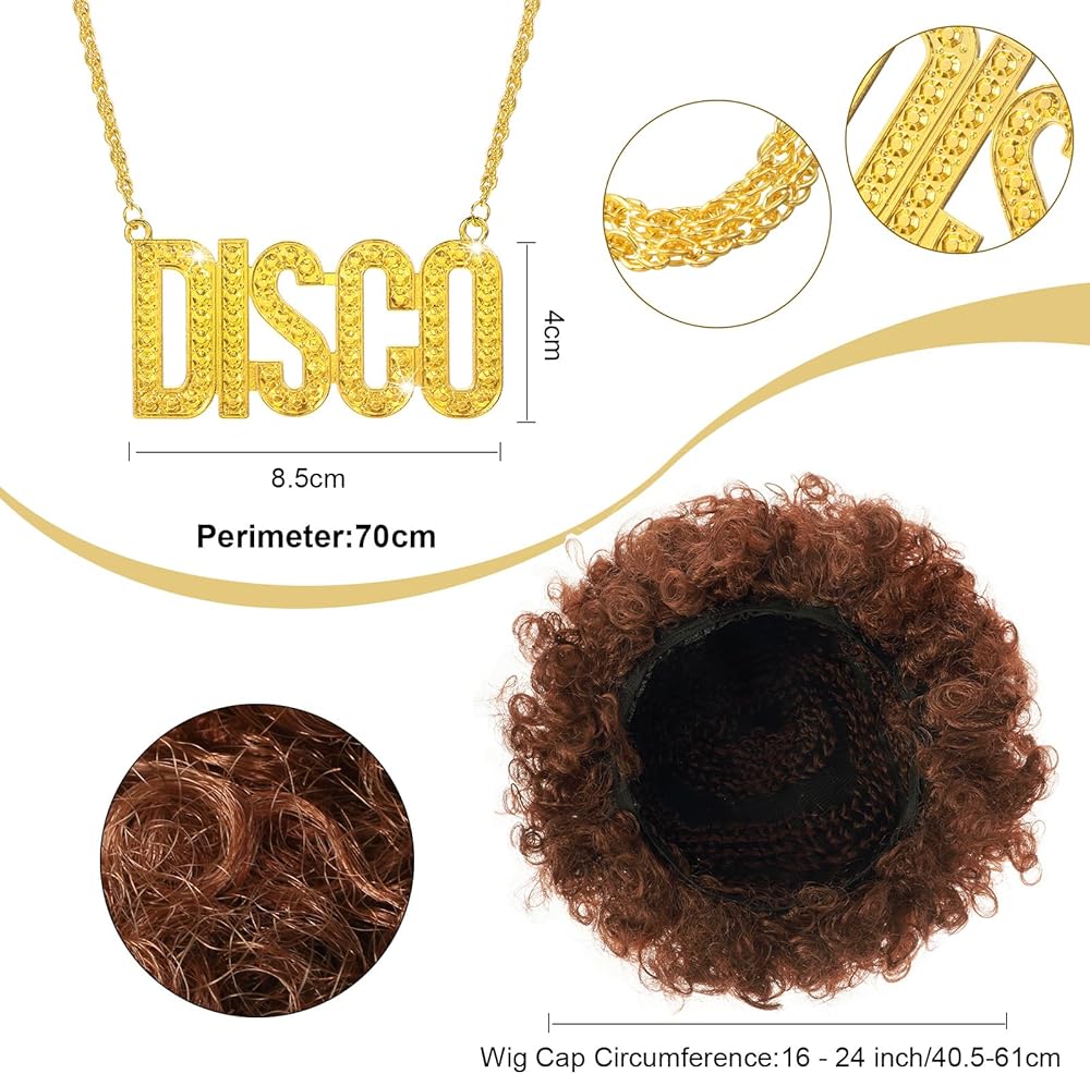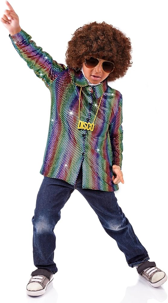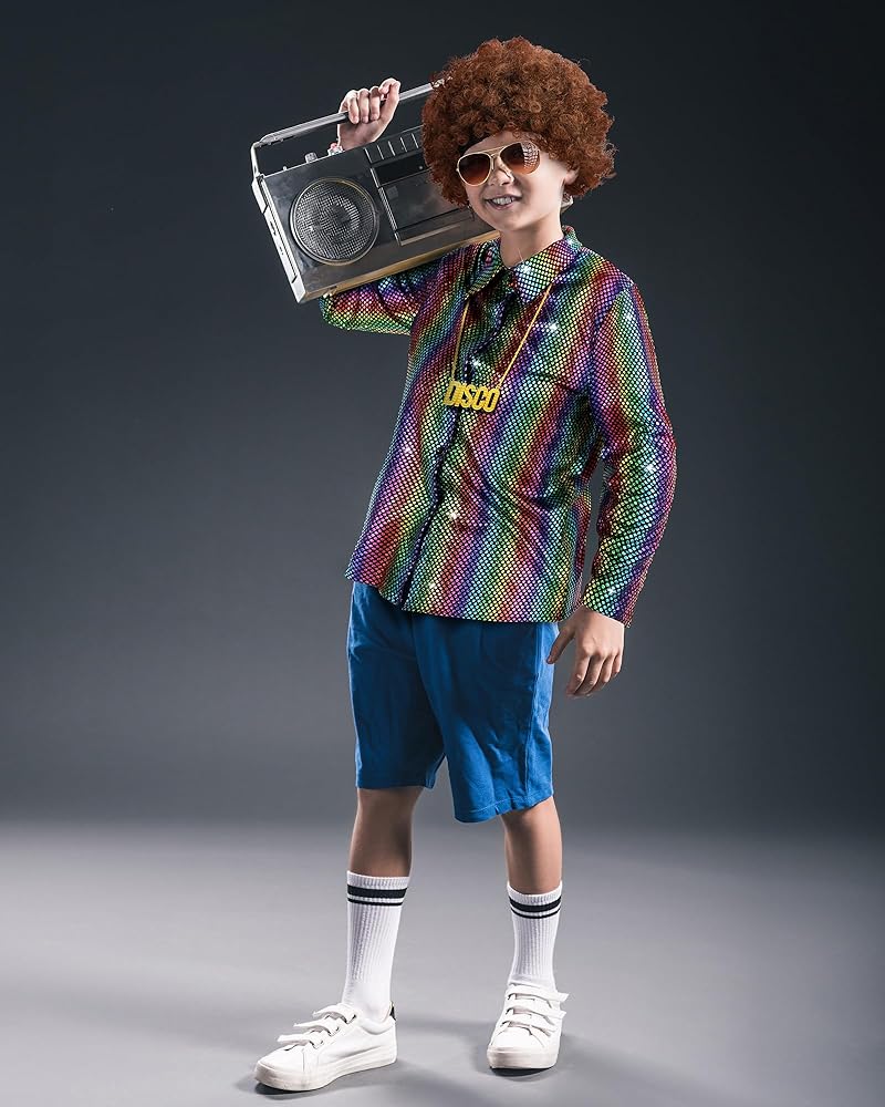 • مجموعة إكسسوارات أزياء هيبي ديسكو للأولاد: تتضمن العبوة قطعة واحدة للأطفال من قميص طويل الأكمام مزين بالترتر اللامع، وحزمة واحدة من شعر مستعار أفريقي ضخم بني، وقلادة واحدة بعلامة ديسكو وزوج من النظارات الشمسية، ستجلب لك إكسسوارات ملابس هيبي الأنيقة والرقيقة من الستينيات والسبعينيات والثمانينيات سحر جذاب