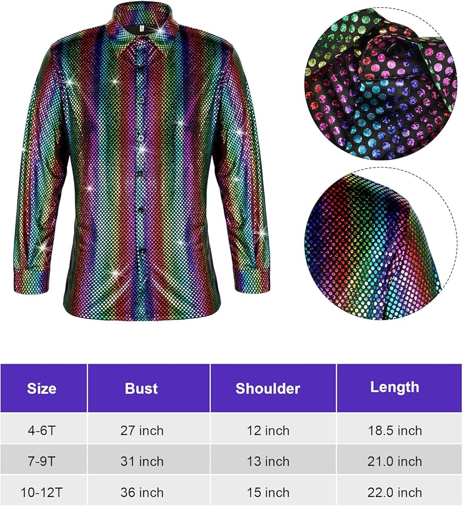 • تصميم متطور: قميص ديسكو ذو أكمام طويلة مزين بالترتر من الستينيات والسبعينيات والثمانينيات للأطفال يحتوي على زر إغلاق من أجل الراحة والعملية؛ مملوء بالترتر الأحمر والأصفر والأخضر والأزرق والأرجواني وغيرها من الترتر للحصول على مظهر لامع وجذاب؛ إنها ليست مناسبة فقط للملابس التنكرية، ولكن أيضًا يمكن استخدامها في الحياة اليومية للأولاد لإضافة سحر