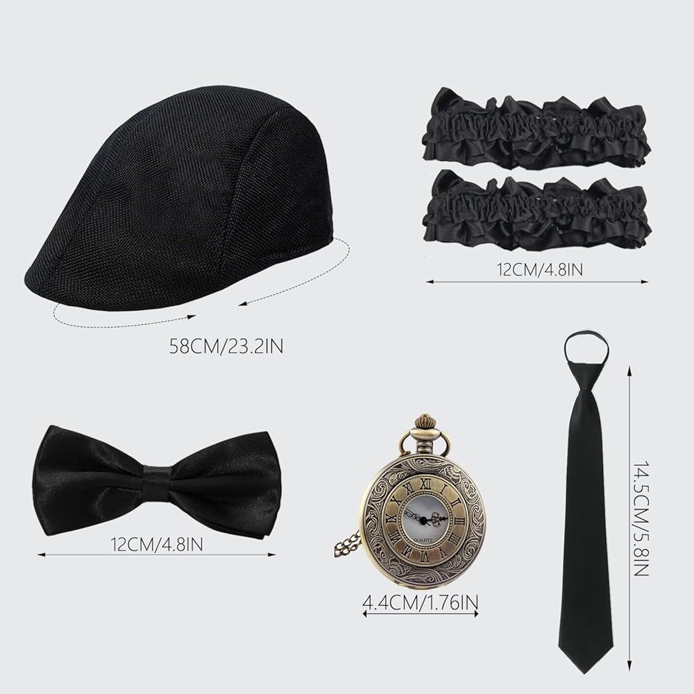 تتضمن الحزمة: سوف تحصل على حزمة الملحقات الرجالية الخاصة بنا من عشرينيات القرن العشرين بما في ذلك: 1 × قبعة كلاسيكية الطراز، 1 × ربطة عنق، 1 × ربطة عنق، 1 × ساعة جيب عتيقة، 2 × أحزمة للذراع. كل هذه العناصر ذات عناصر قديمة قوية، ومناسبة جدًا لمختلف الإطلالات الرجالية القديمة، مما يجعل كل مظهر مميزًا.