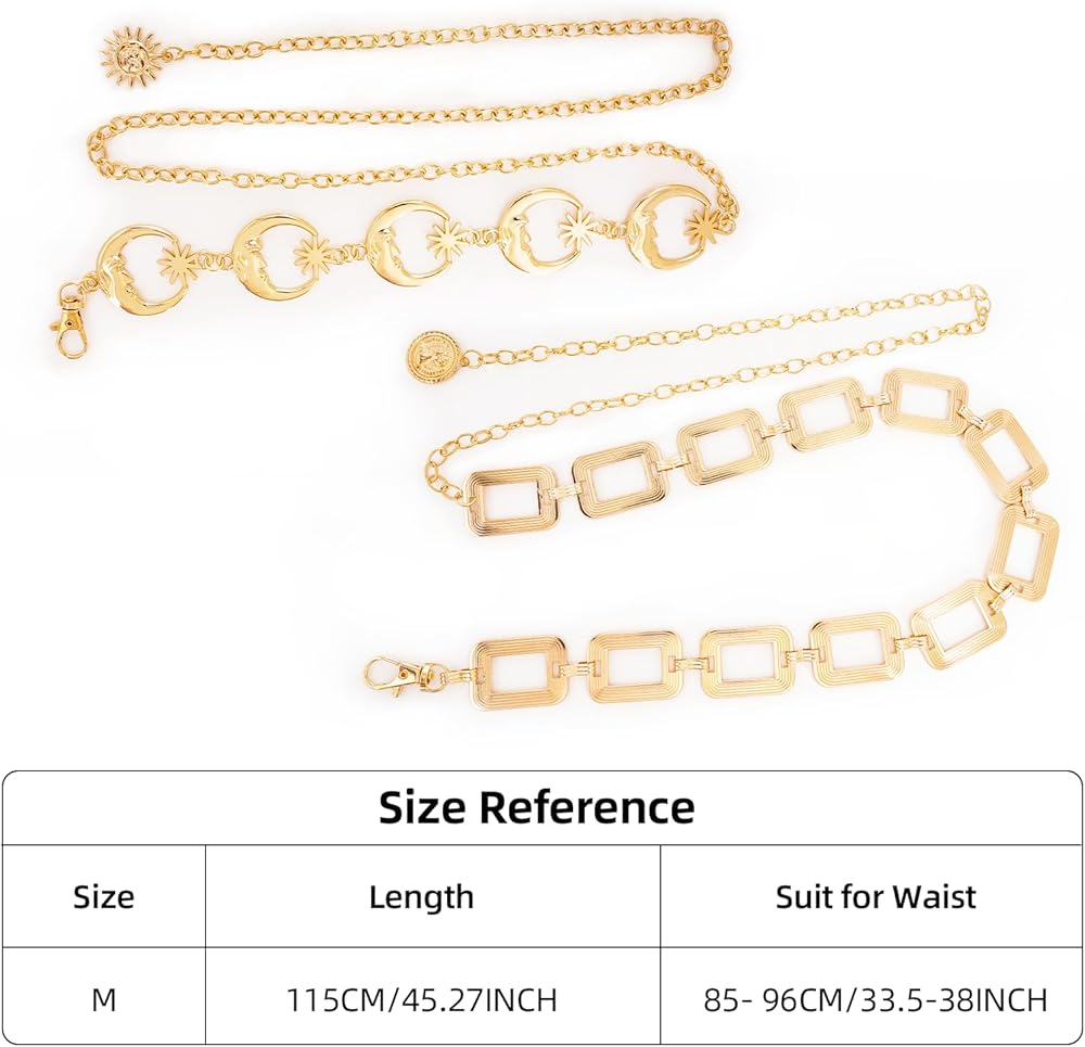 Sizes: Our gold waist chain belt closures with a lobster clasp for easy on and off, the belt length is 45in/115cm for women with waist up to 38inch; You can choose the right size according to your waistline to go with your various outfits