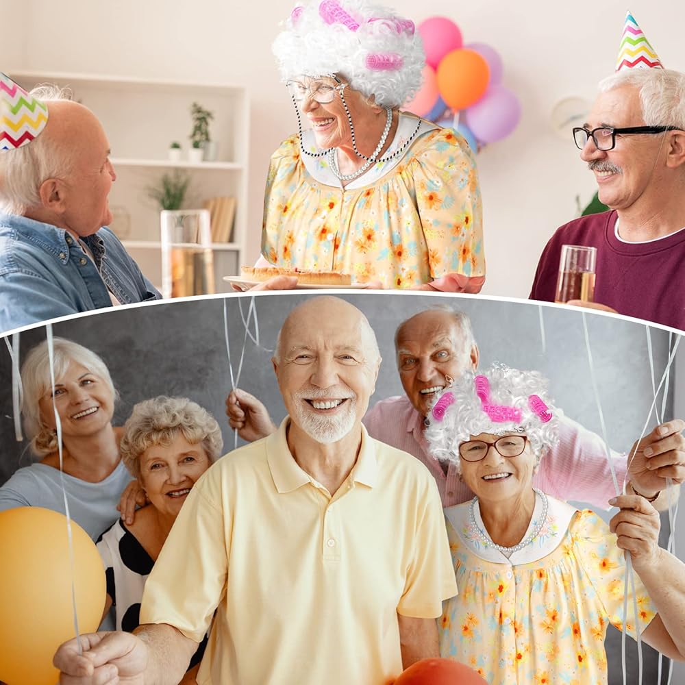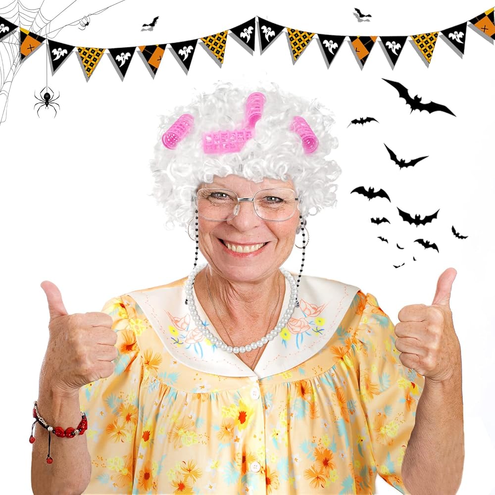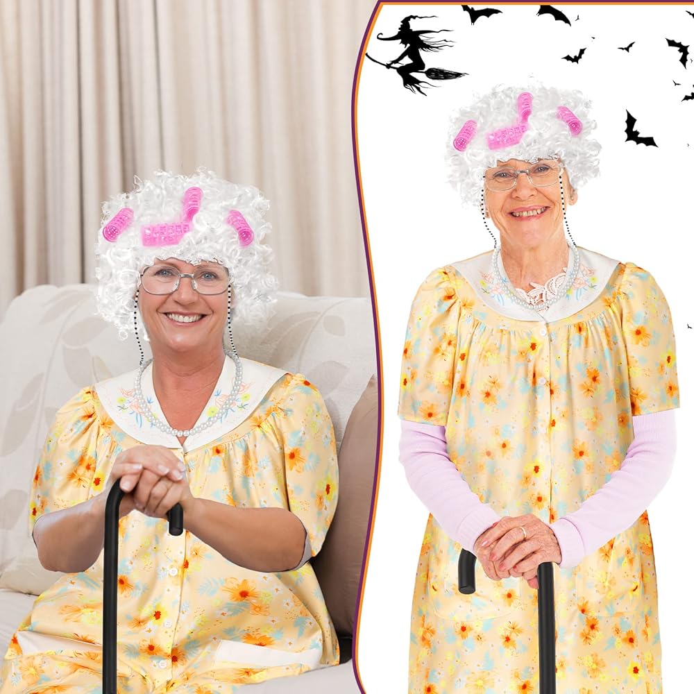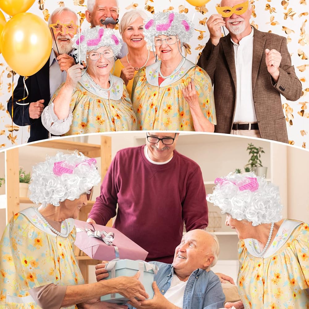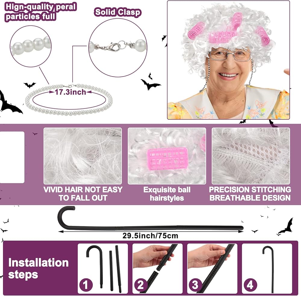 • زي السيدة العجوز التنكرية: سوف تحصل على رداء نسائي قصير الأكمام مع طبعات زهور، وشعر مستعار الجدة، وقبعة شعر مستعار للجدة، وزوج من نظارات الجدة، وسلسلة نظارات، وقلادة من خرز اللؤلؤ الصناعي وعكاز قابل للتعديل، يكفي للعب دور سيدة عجوز في إحدى الحفلات، مجموعة أزياء السيدة العجوز ستوفر وقتك وطاقتك في المطابقة، مناسبة للحفلات التنكرية