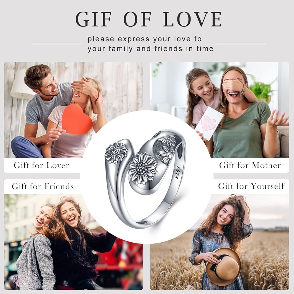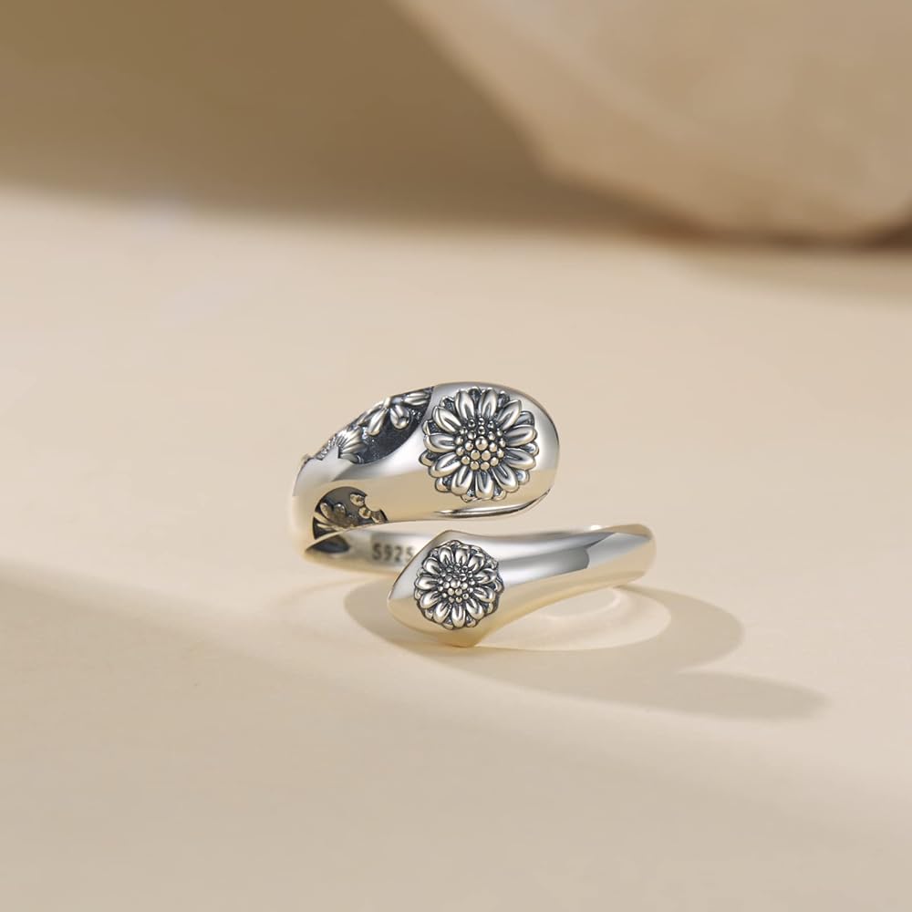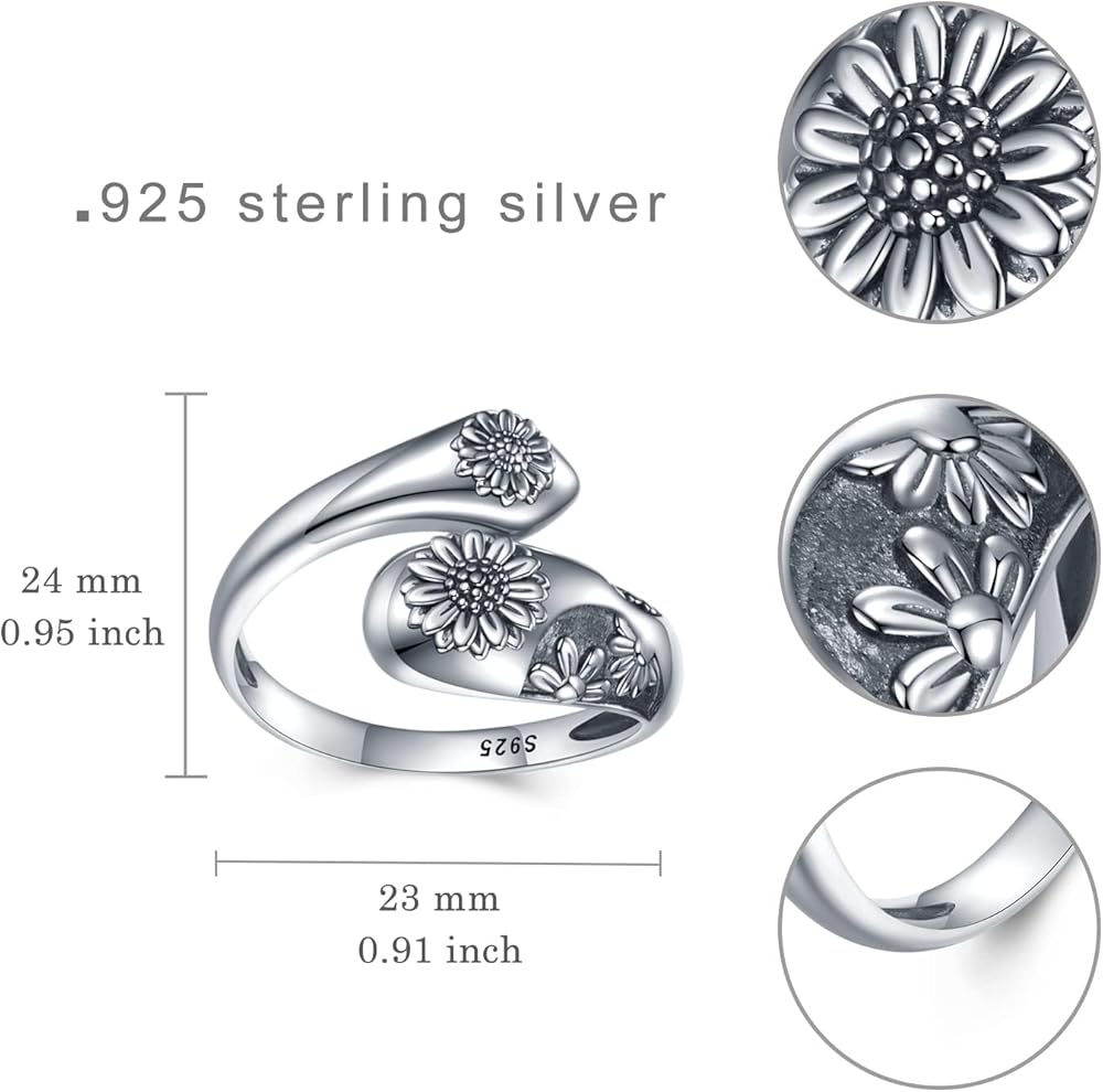 خواتم عباد الشمس للنساء 925 فضة خمر ملعقة حلقة ديزي حلقات قابلة للتعديل أنت بلدي أشعة الشمس زهرة بيان الفرقة للنساء