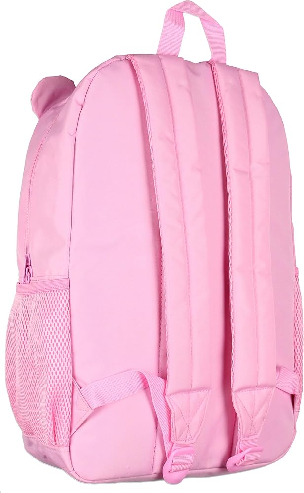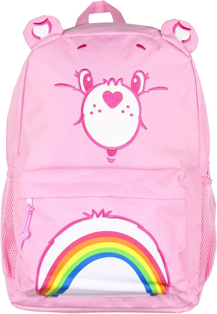 Brighten your day with this cheerful Care Bears backpack featuring everyone's favorite, Cheer Bear! The front showcases an adorable embroidered face of Cheer Bear, complete with her rainbow belly badge design, and playful 3D ears that stick out from the top for extra charm. This backpack offers plenty of room for all your essentials with a spacious main zipper compartment that includes a laptop pouch, a smaller front zipper pocket for quick-access items, and two convenient side mesh pockets for water bottles or snacks. Designed for comfort and convenience, the padded adjustable straps provide a custom fit, while the top loop allows for easy grab-and-go or hanging. Whether heading to school, traveling, or embarking on a new adventure, this Care Bears backpack is the great companion to keep your day full of sunshine and rainbows!