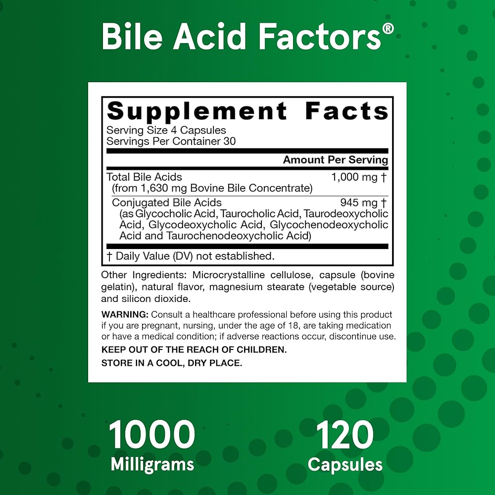 Dietary supplement with 1000 mg of highly concentrated conjugated bile acids from U.S. and/or New Zealand bovine bile.