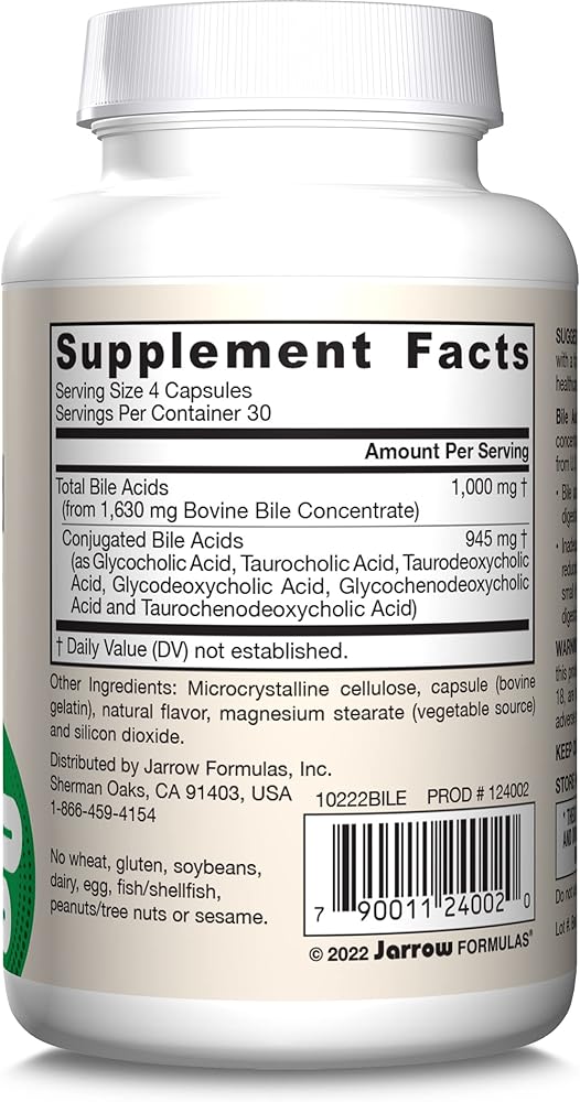 Jarrow Formulas Bile Acid Factors delivers highly concentrated conjugated bile acids in easy-to-take capsules to help your body absorb fats and fat-soluble nutrients.* Made with high-quality, non-GMO ingredients, this gluten free dietary supplement contains no wheat, soybeans, dairy, egg, fish, shellfish, peanuts, tree nuts or sesame. Each serving provides 1000 mg of bile acids mostly in conjugated form (called bile salts) from U.S. and/or New Zealand bovine bile to help emulsify fats in the small intestine to support fat digestion and absorption.* Suggested Use: Adults, take four capsules once a day with a fat-containing meal or as directed by your qualified healthcare professional. Informed by strong scientific research, Jarrow Formulas products are carefully crafted to ensure you get the benefit of each and every vitamin, mineral and supplement.