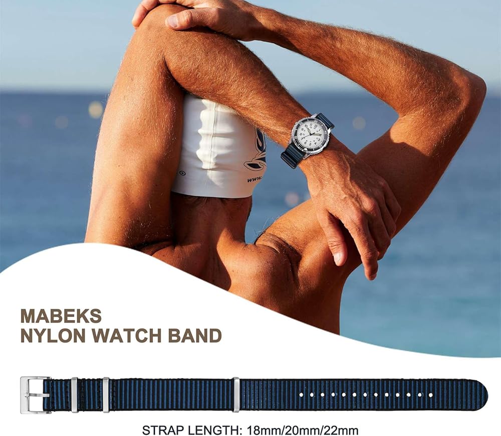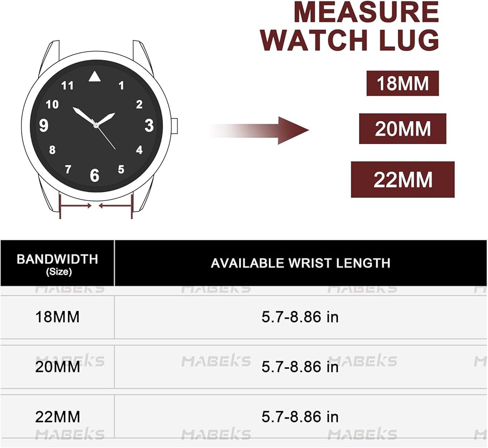 خدمة MABEKS: تتضمن العبوة - سوار ساعة من النايلون. لا تشمل الساعة. لتوفير وقتك وجهدك، يرجى اختيار المقاس الصحيح لساعتك. دقة المليمتر مهمة جدا. توفر لك MABEKS أحزمة ساعة مقاس 18 مم و20 مم و22 مم. إذا كان لديك أي مشكلة مع الحزام الخاص بنا، فلا تتردد في الاتصال بنا.