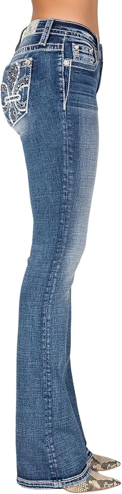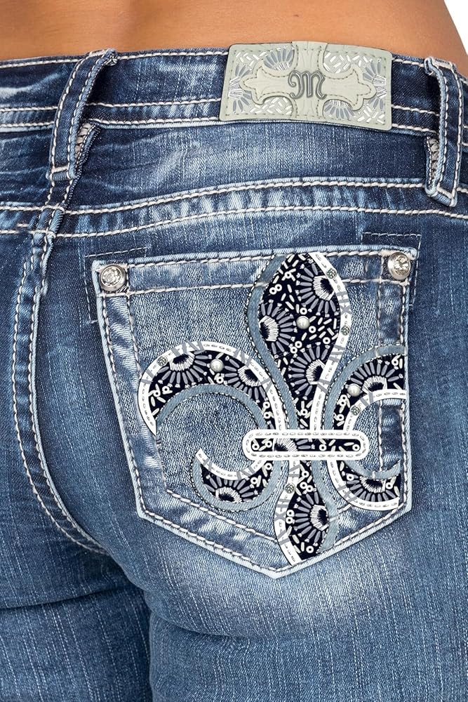 Discover the perfect blend of style and comfort with the Miss Me Fleur De Lis Abstract Stitch Mid-Rise Bootcut Jeans. These mid-rise, medium-wash jeans feature intricate embel lishments, enhanced by clear rhinestone rivets. The flattering bootcut design and slight fading add a touch of vintage charm. They offer a comfortable fit with just the right amount of stretch. Complete with a 5-pocket design and an embossed leather M logo brand patch, these jeans are a versatile addition to your wardrobe.