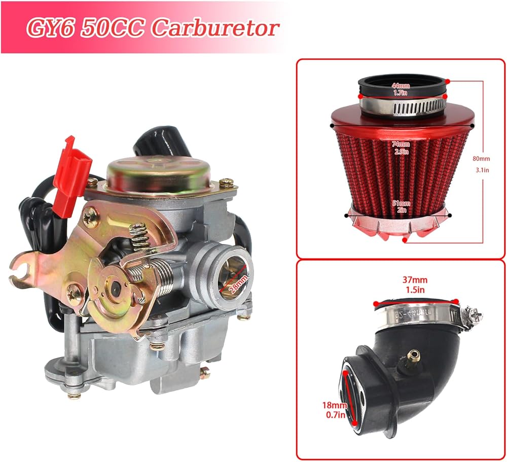 【مكربن GY6 50CC】محرك مكربن 50cc 4 أشواط عالي الأداء GY6 49cc 50cc 80cc رباعي الأشواط. تم تجهيز مكربن الدراجة 50CC بمحرك نفاث رئيسي رقم 75 للحصول على نسبة أفضل من الوقود إلى الهواء، مما يضيف قوة حصانية وتدفق الهواء إلى سيارتك