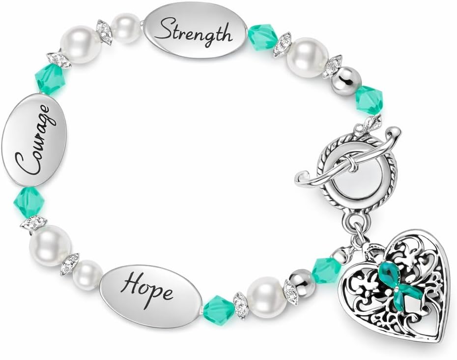 سوار بشريط أزرق مخضر: سوار التوعية بشريط "الأمل، الشجاعة، القوة" الخاص بنا رائع لزيادة الوعي وإظهار الدعم لسرطان المبيض، واضطراب الإجهاد ما بعد الصدمة (PTSD)، والاعتداء الجنسي، وغيرها من الأسباب التي يمثلها الشريط الأزرق المخضر.