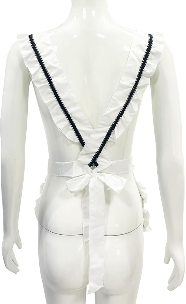 - Ruffles around the apron and fixed cross back straps with straps that tie at the waist
