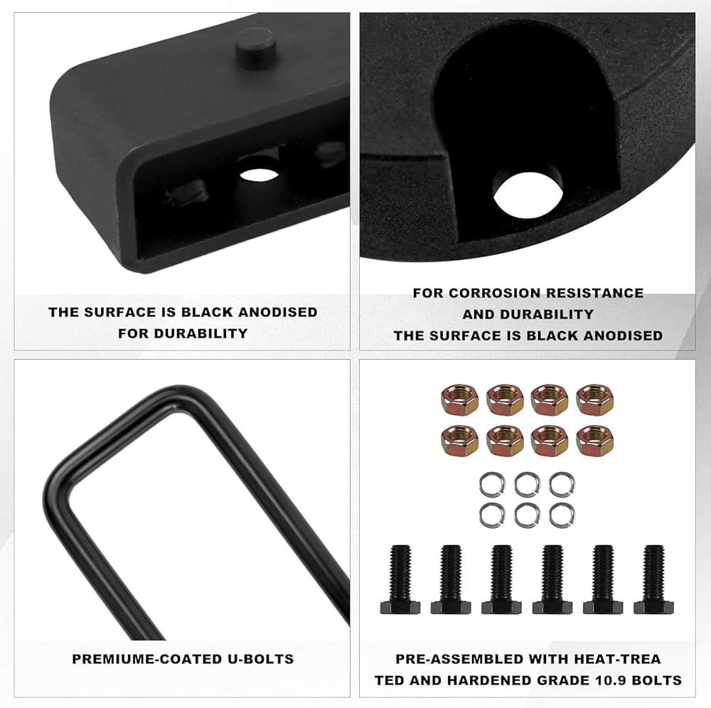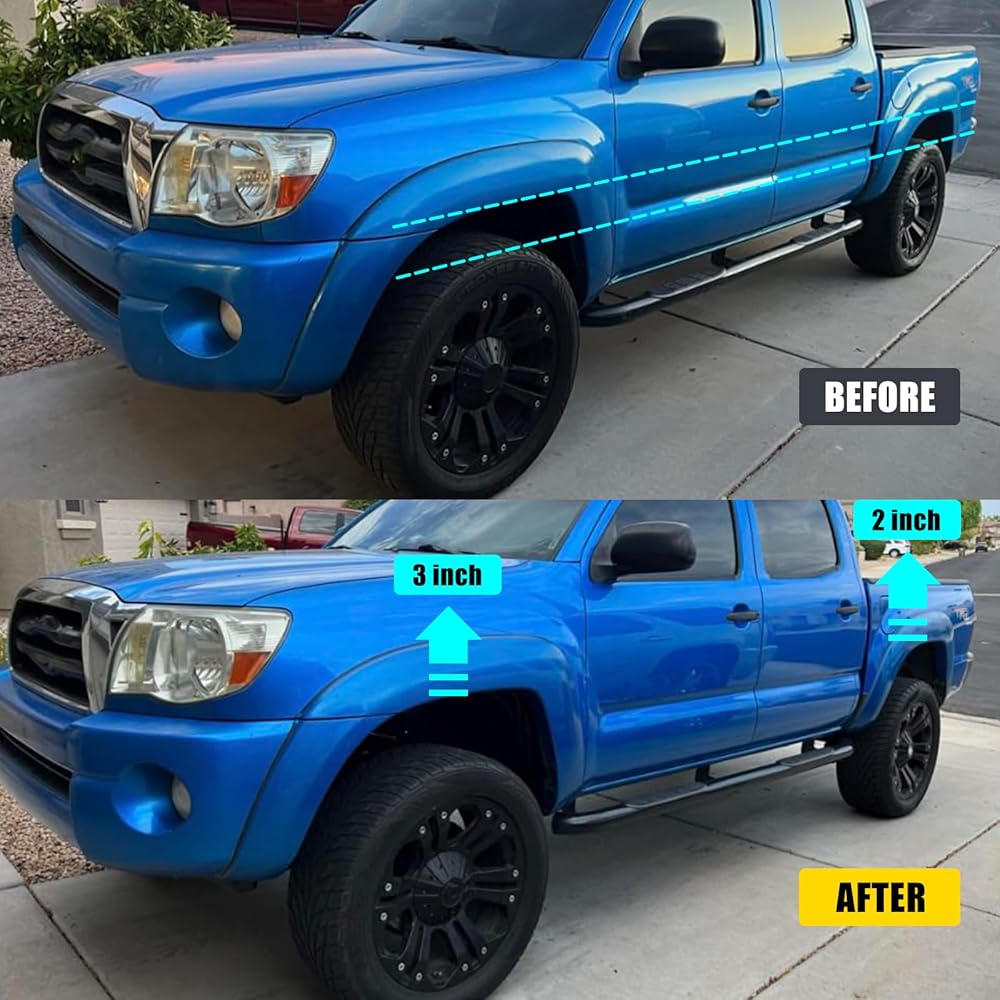 • [ملاحظة] ترفع المجموعة الجزء الأمامي من شاحنتك بمقدار 3 بوصات والجزء الخلفي بمقدار 2 بوصة، مما يحسن بشكل كبير مظهرها وأدائها وأسلوبها. نظرًا لهندسة التعليق، فإن ارتفاع الرفع وسمك المجموعة ليسا بنسبة 1:1. يضمن هذا التصميم المحاذاة والوظيفة المناسبة لنظام التعليق الخاص بك.