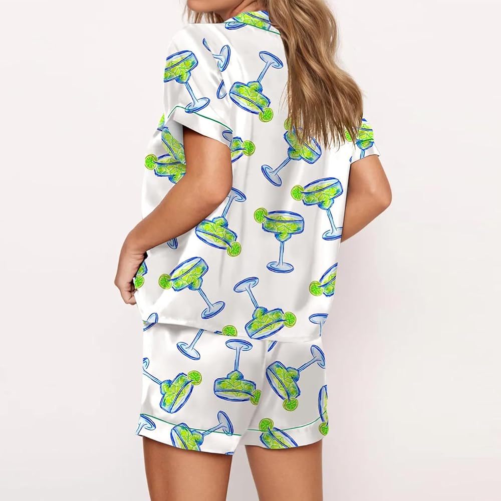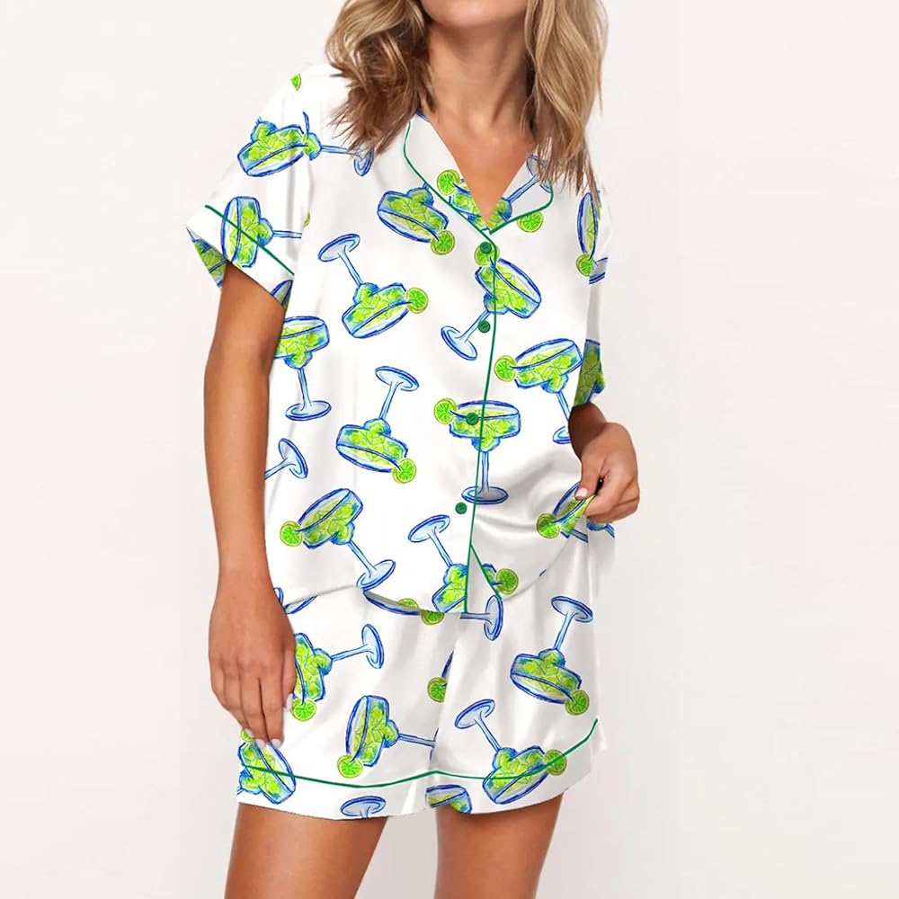 Women's 2 Piece Pajama Set, Fashion Print Short Sleeve Button Down Tops Elastic Waist Shorts for Summer