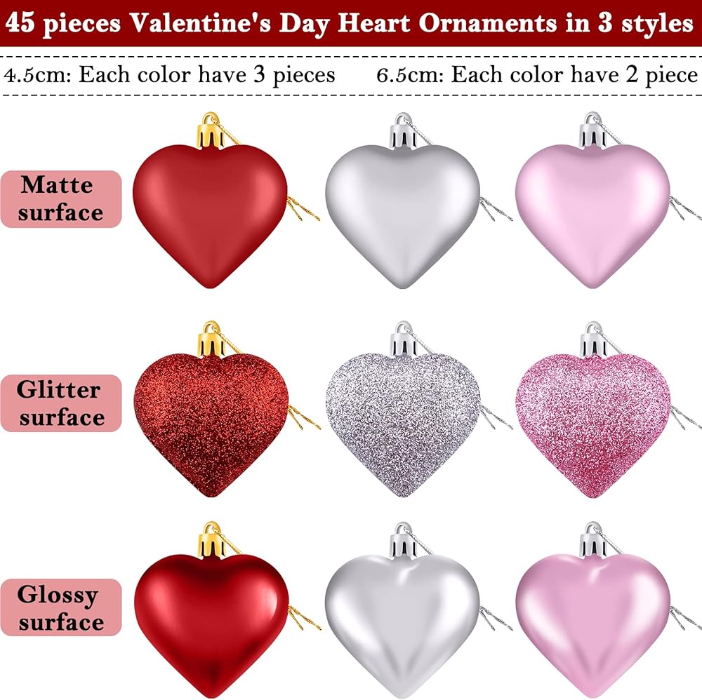 45 قطعة من زينة قلب عيد الحب: تتضمن العبوة 45 قطعة من حلي القلب الذهبية البطل في 4 أنواع مختلفة (سطح لامع، سطح غير لامع، سطح لامع وسطح مزخرف) بمظهر ثلاثي الأبعاد، جميل ولافت للنظر، استمتع بعيد الحب الرائع