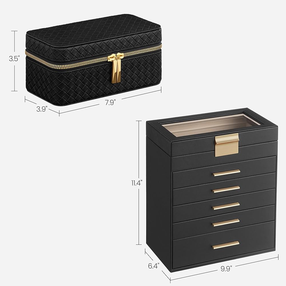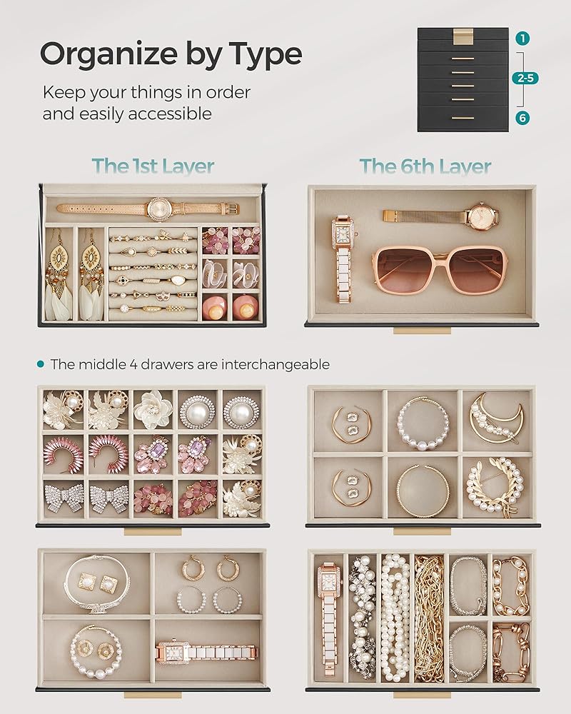 【تخزين، 6 طبقات】حافظ على جميع مجوهراتك منظمة في صندوق المجوهرات هذا - تدخل القطع الصغيرة من المجوهرات في الفتحات المختلفة للطبقات الخمس العلوية، وتوضع النظارات الشمسية والساعات في الدرج السفلي الكبير.