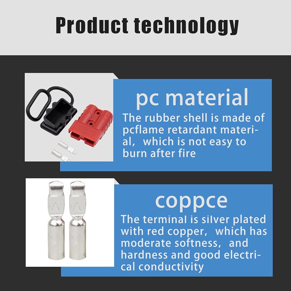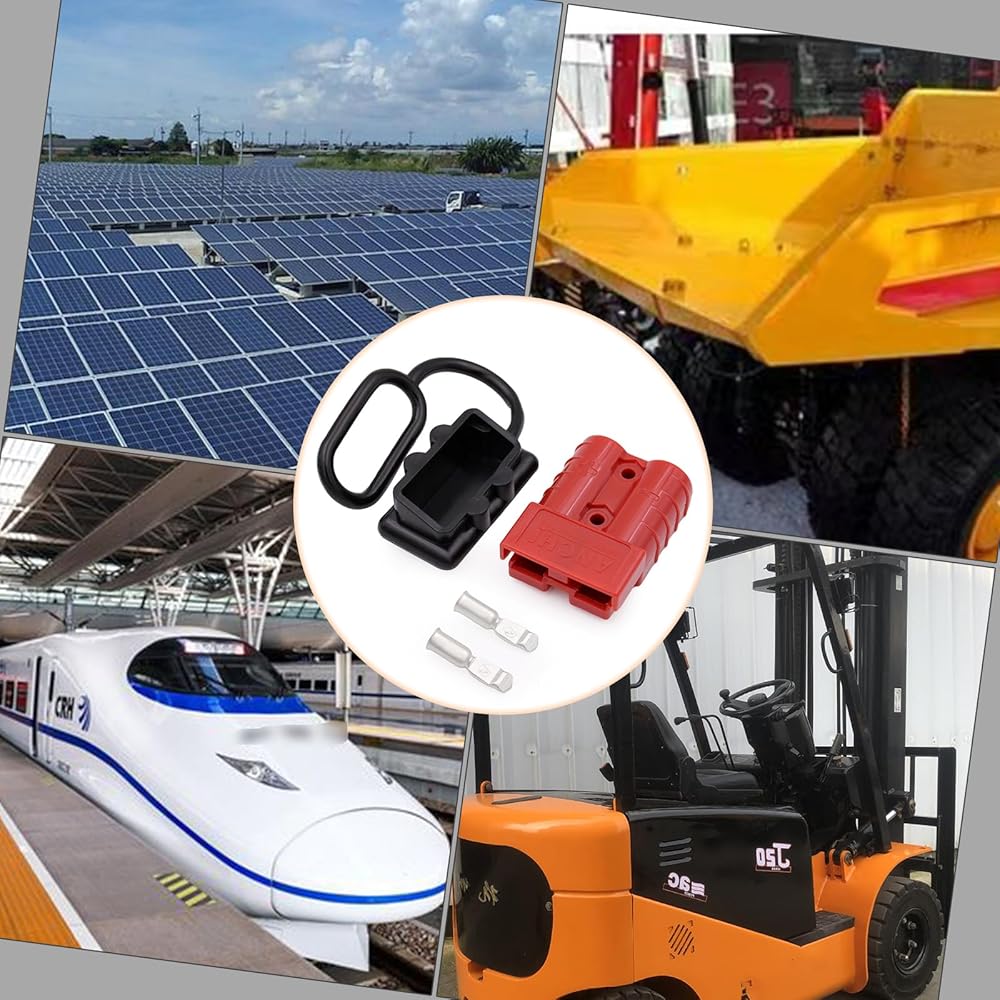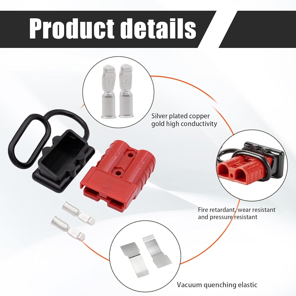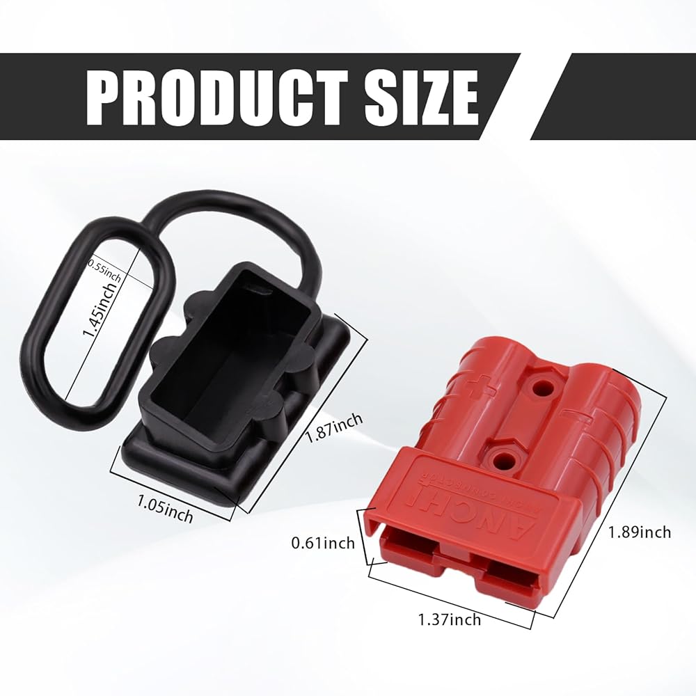 Packing List: The package includes 2 x red plugs, 2 x dust covers, 4 x terminal pins. Maximum voltage 600V, capacity 50A. Suitable for most cars, winches, trailers, cable terminals or other optional connectors on the car.