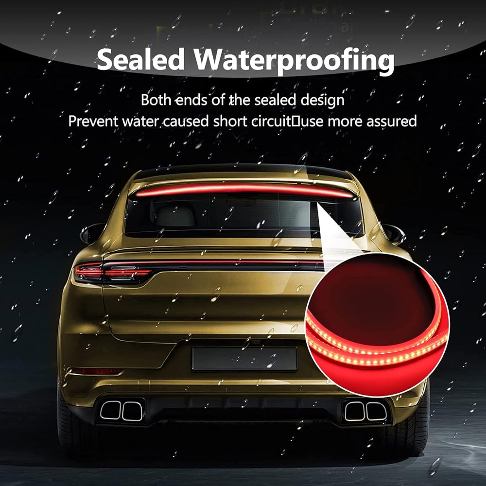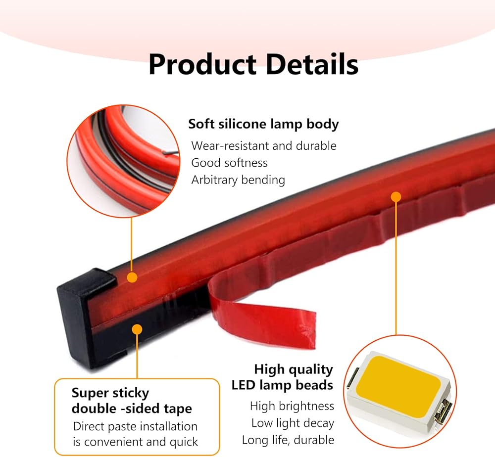 • 🚕 Durable in All Seasons: Made of flexible soft silicone to withstand any harsh weather and harsh environment. the LED strip is designed with IP67 waterproof braking system connection cable and has a service life of over 30,000 hours. Perfectly curved design to increase the flow disturbance effect.