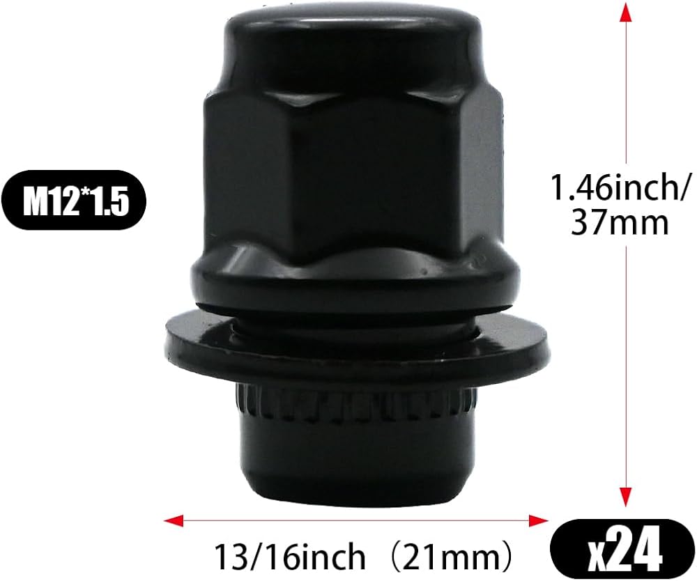 SPECIFICATION - M12x1.5 Thread - closed end bulge style lug nuts - conical 60 degree seat - 13/16" (21mm)hex - 1.46"(37mm) Hight - color: Black .(NOTE: Please tighten the lug nuts manually, DO NOT use electrical tools)