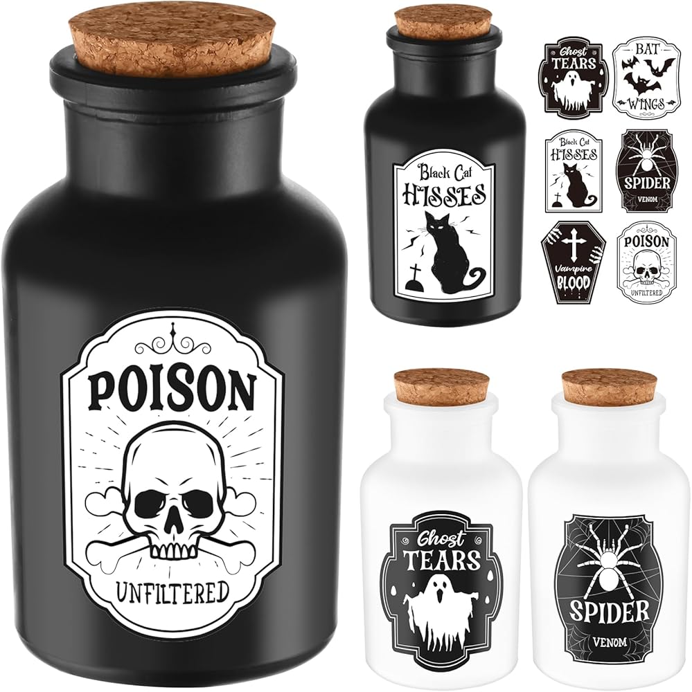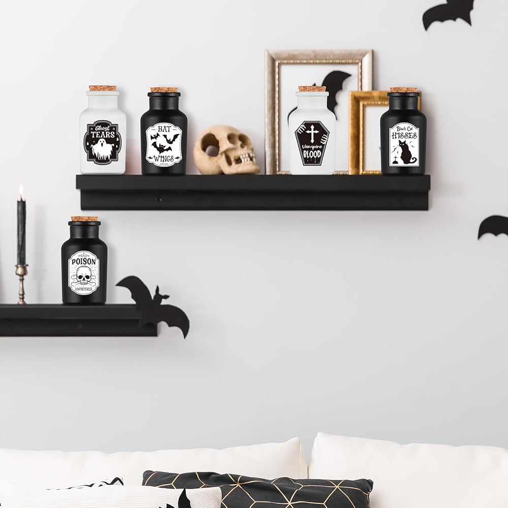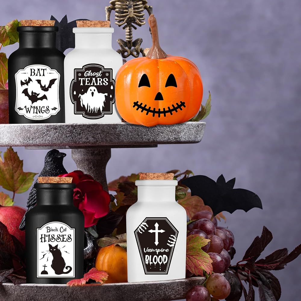 تتضمن المجموعة - تتضمن حزمة الهالوين الشاملة هذه 4 زجاجات جرعات و6 ملصقات للهالوين باللونين الأبيض والأسود، مما يسمح لك بإطلاق العنان لإبداعك وإضفاء طابع شخصي على زجاجات جرعاتك! سواء كنت متحمسًا للساحرات أو تتطلع إلى خلق أجواء الهالوين المخيفة والفريدة من نوعها في المنزل، فهذه المجموعة هي الخيار الأمثل! إنها الإضافة المثالية لديكورات الهالوين الداخلية.