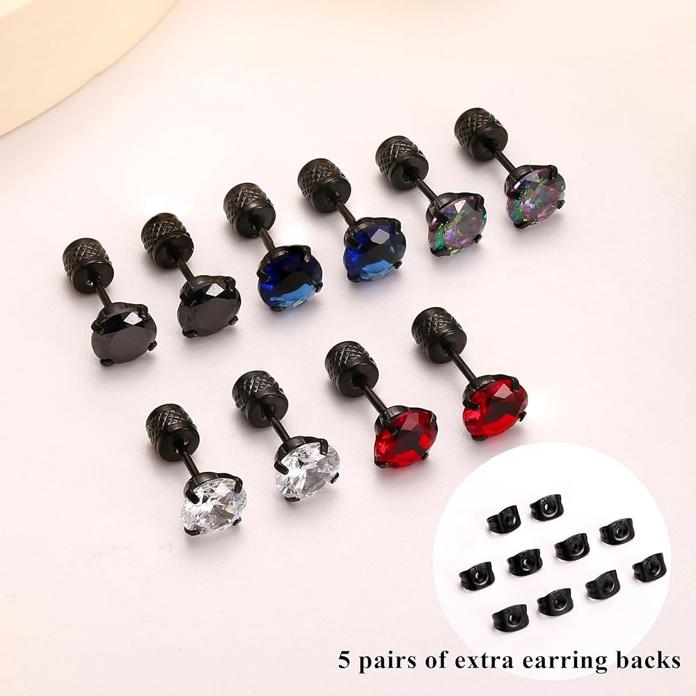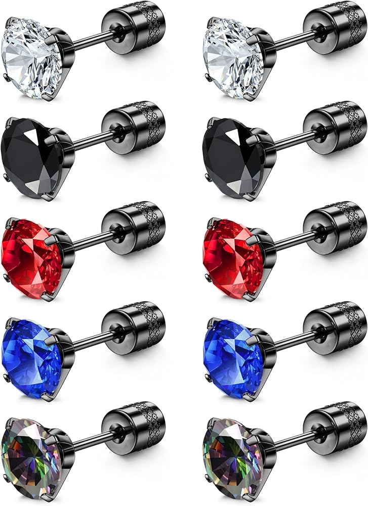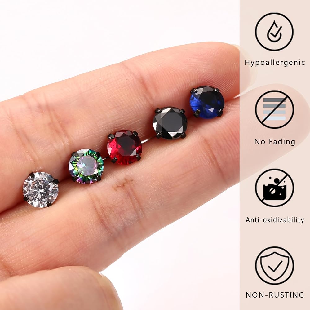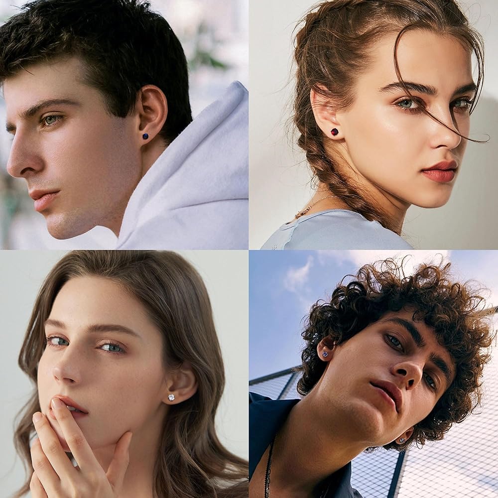 【Stud Earrings Set】There are 5/6 pairs of titanium surgical steel earrings in a pack. Includes round/square cubic zirconia stud earrings, white/dark blue/black/AB color/red tiny flat back stud earrings with silver/black tone plated.2/3/4/5/6/8mm cubic zirconia are available. Titanium stud earrings can be worn individually or stacked, suitable for second hole, cartilage, helix piercing jewelry...