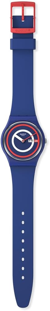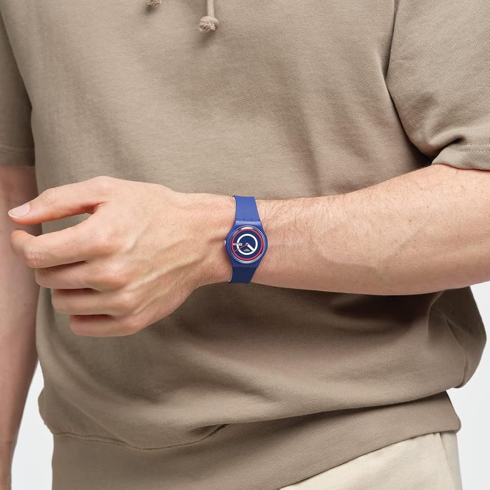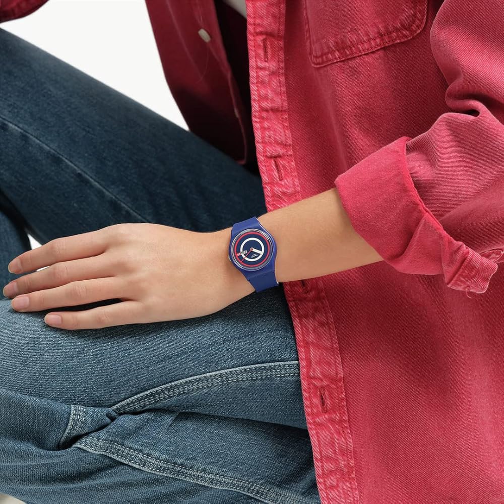 The star of this GENT BIOSOURCED watch is a dark blue dial with red and white print, a day-date window and biosourced glass set on a blue and white silicone strap. A unique feature of the dial is that the color of the inner and outer circles correspond to the hour and minute hands, respectively.