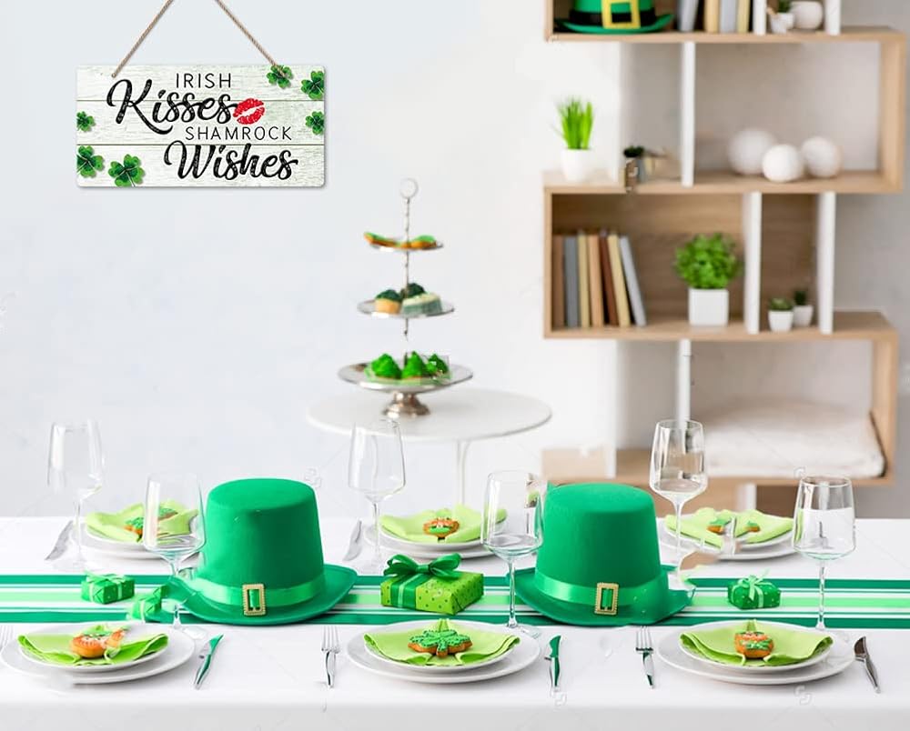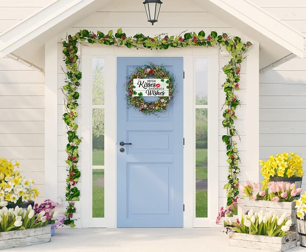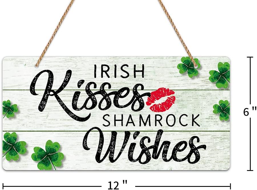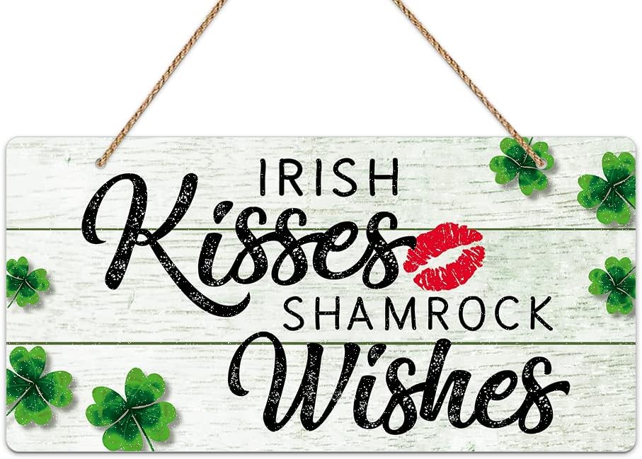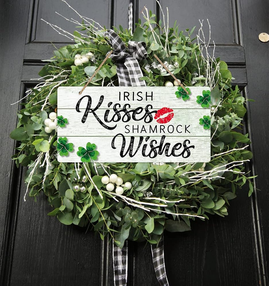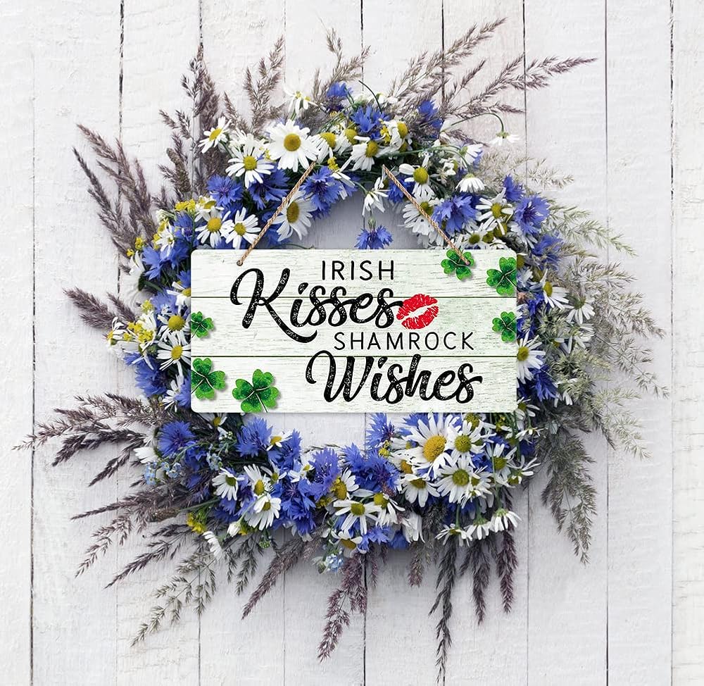 St. Patricks Day Sign Wreath for Front Door Decor, Irish Kisses Shamrock Wishes St. Patricks Door Decorations, 6"x12" St. Patrick's Decor Sign for Home Wall Front Door Porch Decorations