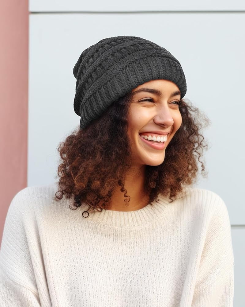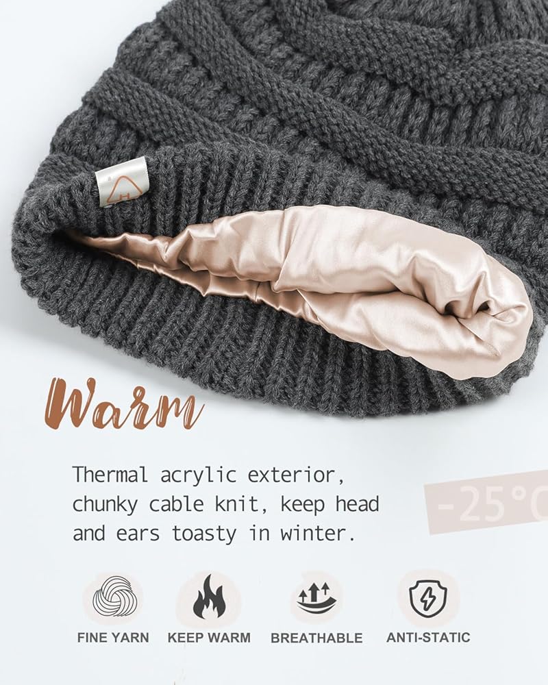 • جودة ممتازة من Hat Hut: الجزء الخارجي للقبعة الصغيرة الخاصة بنا مصنوع بنسبة 100% من الأرسيليك الفاخر الخالي من الآزو؛ البطانة مصنوعة من الساتان الحريري بنسبة 100%، وهي ذات جودة فائقة وأكثر نعومة وسلاسة. نسيج الكابل السميك للقبعة الشتوية سميك بما يكفي لفصل الشتاء، ويضمن تغطية رأسك جيدًا ومعزولًا عن البرد.