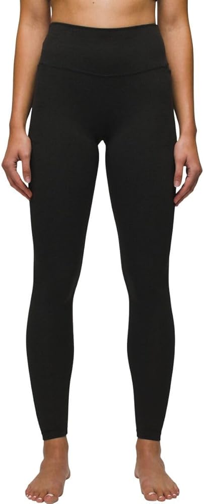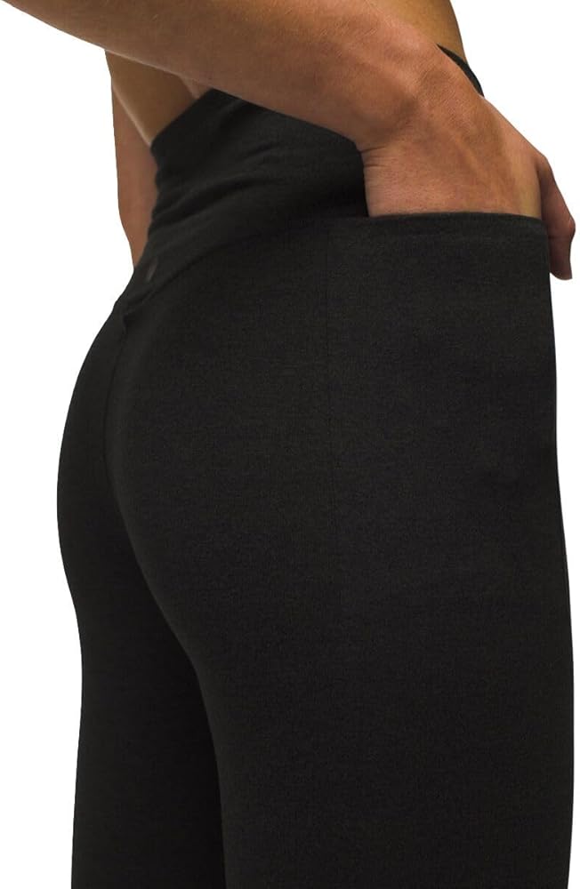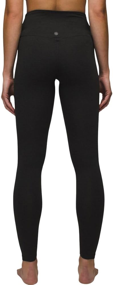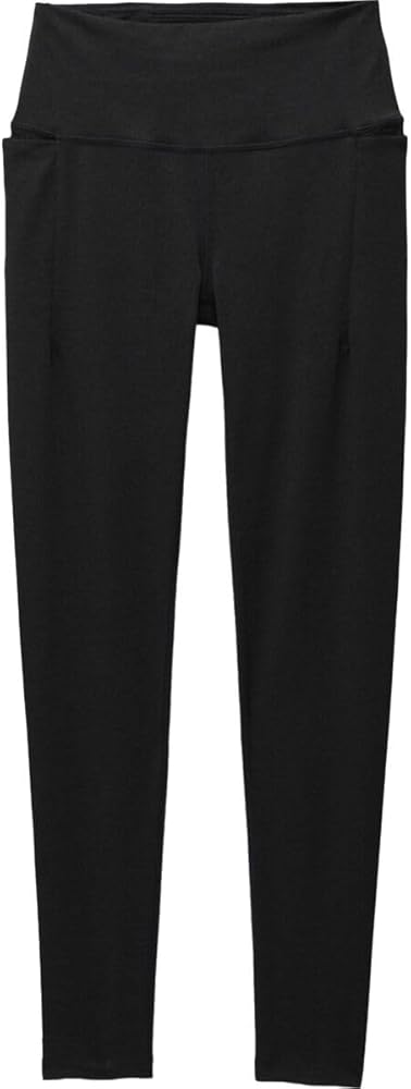 UPF 50+ • Moisture wicking • Wide waistband full length legging • Clean finished drop in side pockets • Hidden back wb pocket • Coolmax (r) triangle gusset for added comfort and reinforcement • prAna logo heat transfer at back waistband • High Rise, Fitted