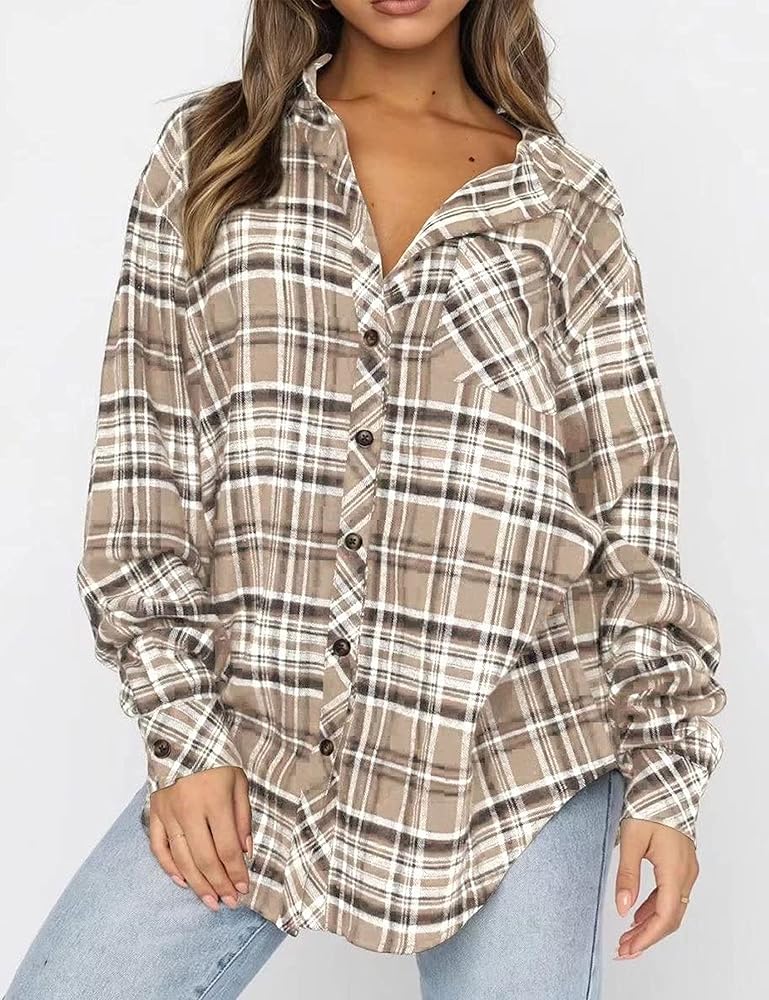 - قمصان فلانيل كبيرة الحجم لربيع وصيف وخريف للنساء، خفيفة الوزن وناعمة ومريحة في الارتداء، قميص فلانيل منقوش بنمط القماش القطني المربع مناسب للصيف والربيع والخريف