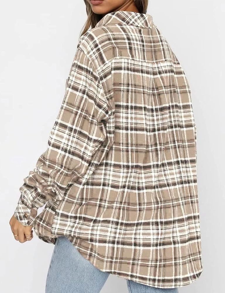 - قمصان فلانيل منقوشة للنساء بأزرار سفلية، جيب واحد على الصدر، قميص مربعات منقوش بافلو، طول متوسط، حاشية منحنية، ياقة طية صدر، قمصان منقوشة بأزرار سفلية للنساء