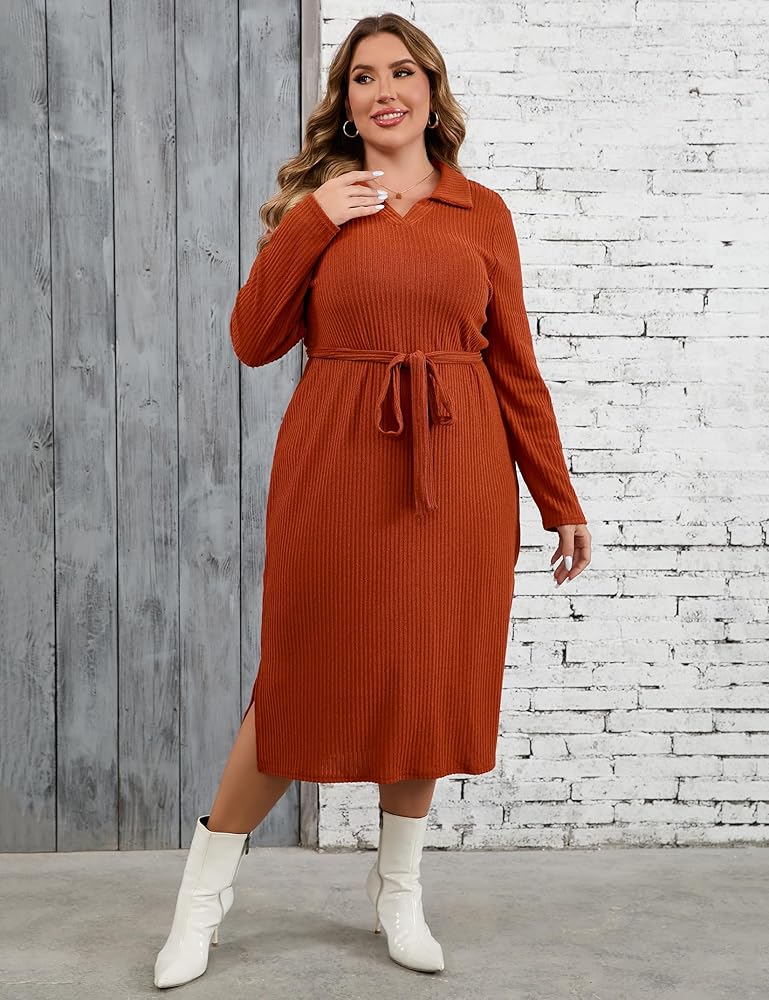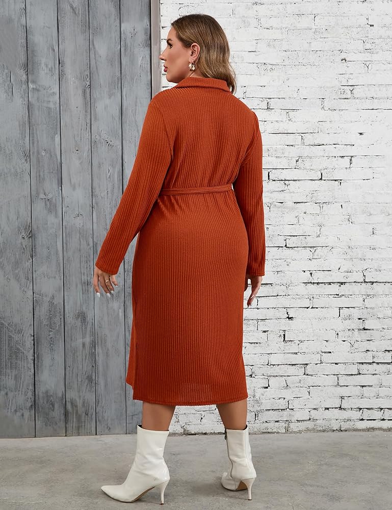 المرأة حجم كبير سترة فستان طوق كم طويل الجانب سبليت البلوز ماكسي متماسكة سترة فستان مع حزام
