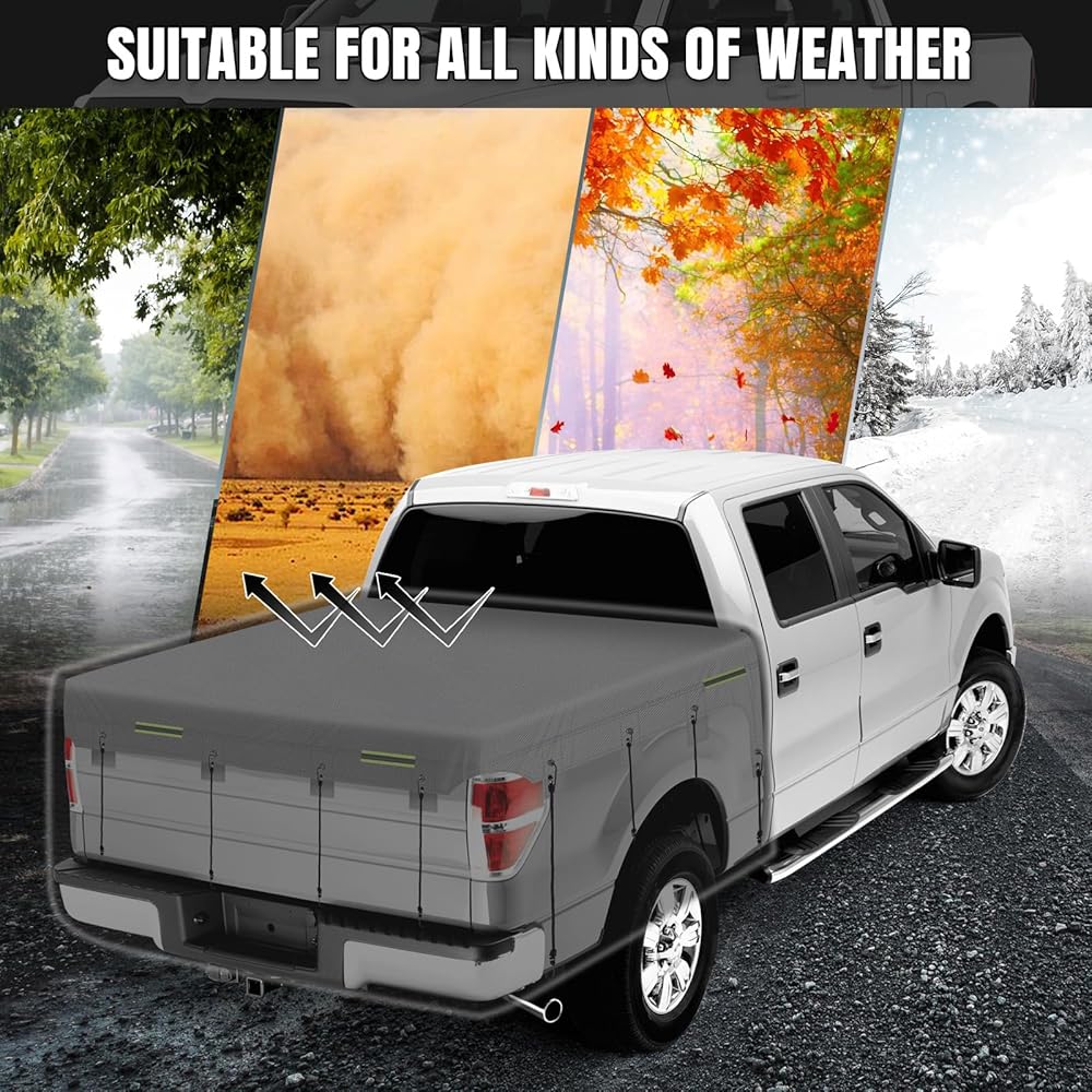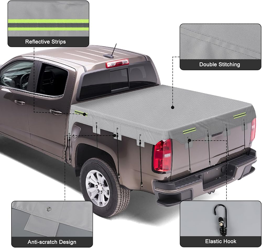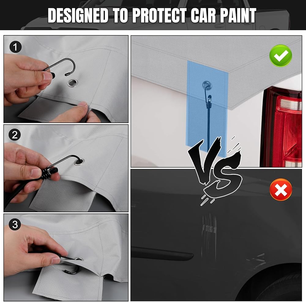 مع 12 حبلًا مرنًا: يمكنك تثبيته بالتساوي أو في أوضاع مختلفة حسب احتياجاتك. لن تخدش شاحنتك الصغيرة. إنه مقاوم للرياح والمطر والغبار، ويحمي حمولتك ومخرطتك.
