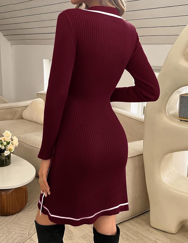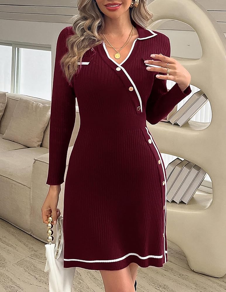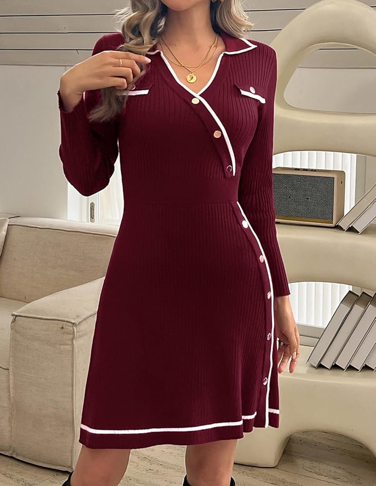• فستان سترة فائق النعومة: فستان محبوك مضلع عالي المرونة، زر مزخرف، فستان سترة بأكمام طويلة، فستان بألوان متباينة، مقاس نحيف، طول متوسط. هذا الفستان ذو السترة متوسطة الطول يحتضن منحنياتك في صورة ظلية مثيرة وأنيقة ومريحة