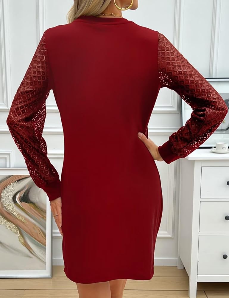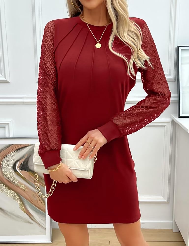 فستان أنيق وعصري: يتميز بتفاصيل طيات أمامية وأنماط دانتيل مربعة معقدة على الأكمام الفانوس، هذا الفستان القصير يصل إلى ما فوق الركبة لإطلالة أنيقة وعصرية.