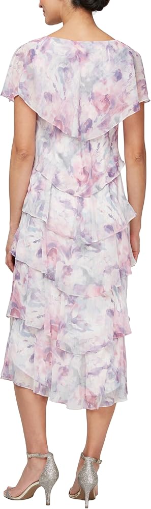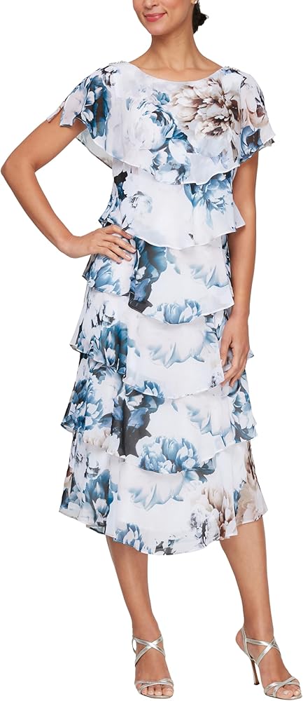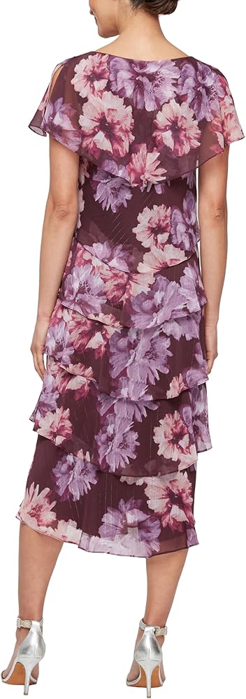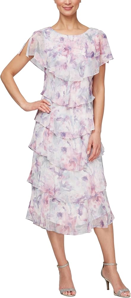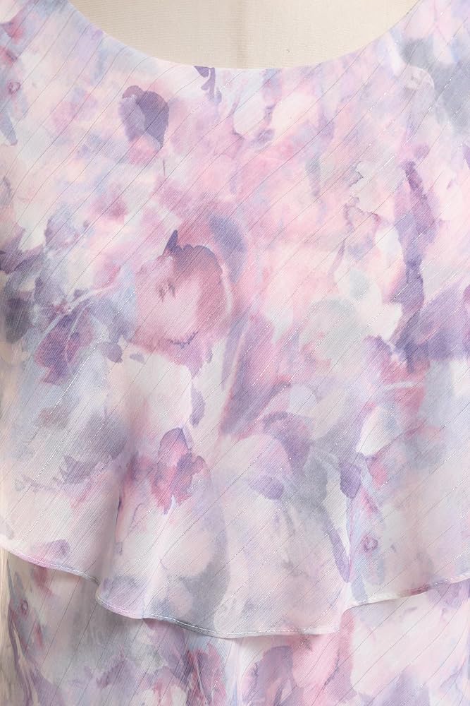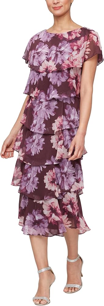 Elevate your wardrobe with our S.L. Fashions Women's Floral Scoop Neck Tiered Midi Length Wedding Guest Dress with Beaded Shoulder. This stunning dress features a captivating floral design and a crystal-beaded pin, adding a touch of glamour to any occasion. Crafted from airy lurex chiffon, this non-stretchy, lightweight midi dress offers sophisticated style and comfort. The shoulder embellishments enhance the overall look, seamlessly combining flair and elegance. The radiant tiered design not only adds aesthetic appeal but also enhances your silhouette with a slimming effect, creating subtle lines that elongate and flatter your figure effortlessly. Perfect for wedding guests and special events, this dress ensures you step out in style.