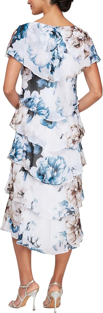 Floral Elegance: Ivory ground floral print, scoop neck, split cape short sleeves, and multi-tiered design adorned with a crystal-beaded pin. Achieve a chic and feminine look with this graceful ensemble.