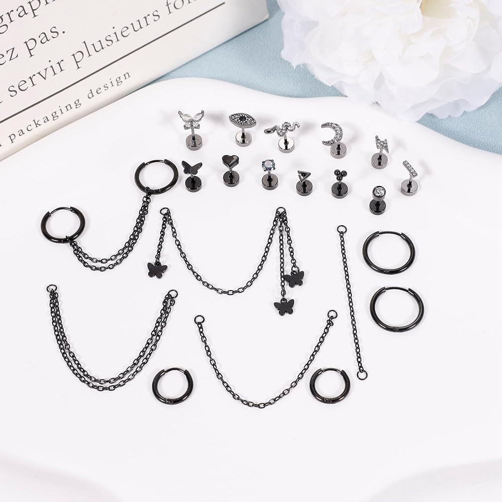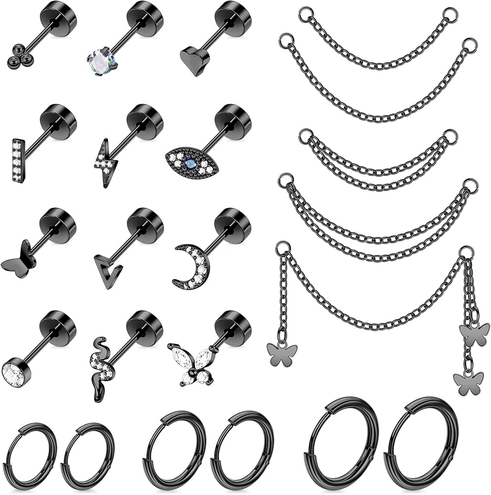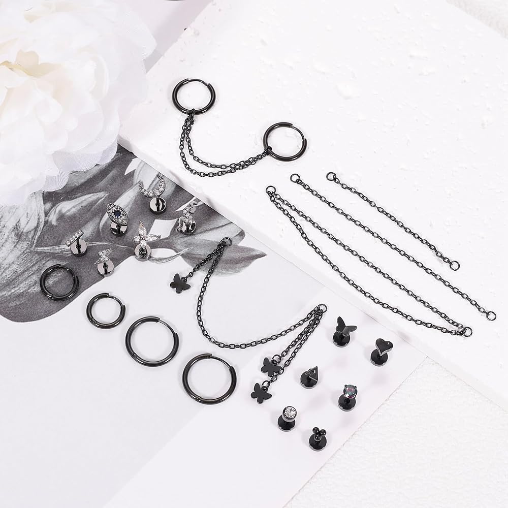 مجموعة أقراط الغضروف: تتكون هذه المجموعة من أقراط الغضروف من 23 قطعة، بما في ذلك 5 قطع من سلاسل الأذن، و3 أزواج من طوق الغضروف، و12 قطعة من مسمار الغضروف. حجم أطواق الغضروف والمسامير 20 جرام. تأتي هذه المجموعة من الأقراط الغضروفية بأربعة ألوان: الذهبي، والذهبي الوردي، والفضي، والأسود. يمكنك المزج والمطابقة وفقًا لتفضيلاتك الخاصة، مما سيضيف بالتأكيد نقاطًا إلى سحرك