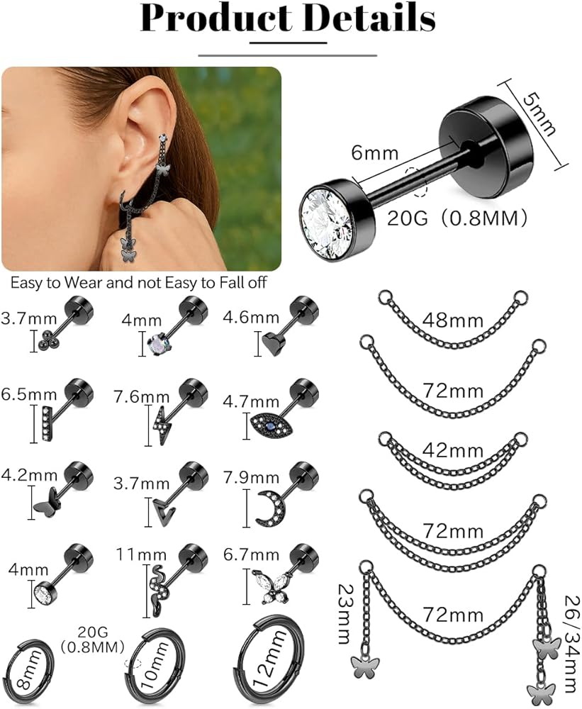 سلسلة الغضروف: هذه الأقراط الغضروفية مصنوعة من الفولاذ المقاوم للصدأ سعة 316L. بسبب خصائصه المادية، فهو ليس عرضة للحساسية والبهتان، كما أنه صديق للبشرة الحساسة. سطح الأقراط الغضروفية أملس ومصقول للغاية، مع زركونيا مكعب لامع مدمج على الأقراط، مما يجعلها تبدو أكثر سحرًا