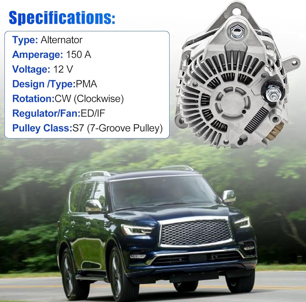 [المواصفات] نوع العنصر: مولد كهربائي، الجهد الكهربي: 12 فولت؛ التيار: 150 أمبير؛ الدوران: CW (في اتجاه عقارب الساعة)؛ منظم/مروحة: IR/IF؛ عدد الأخاديد: بكرة القابض ذات 7 أخدود؛ فئة البكرة: S7