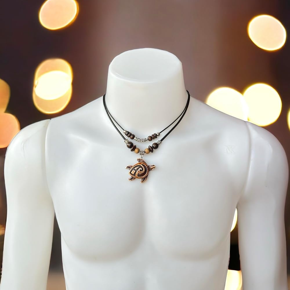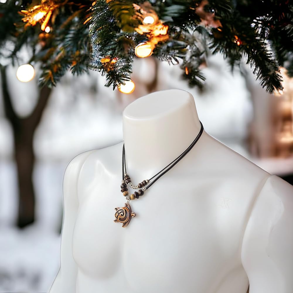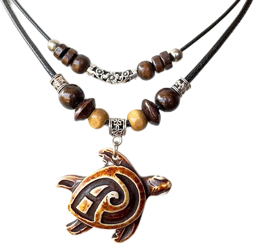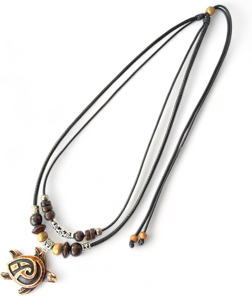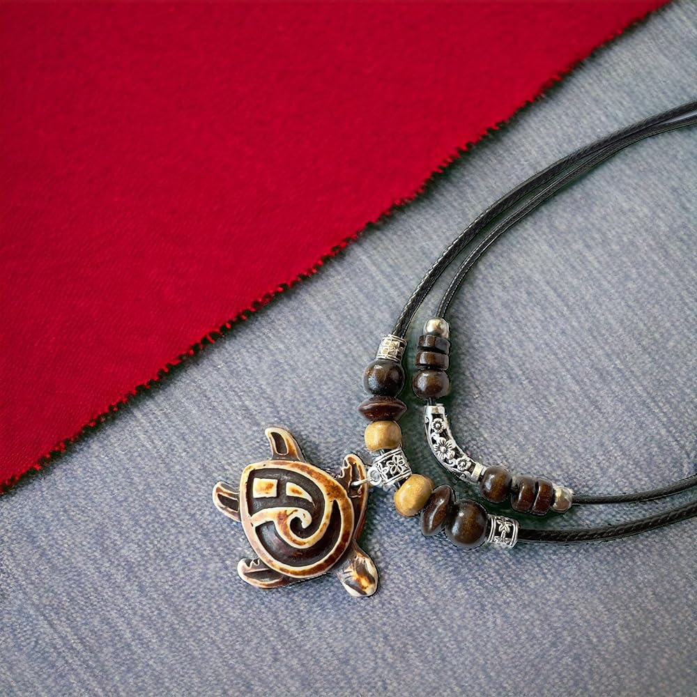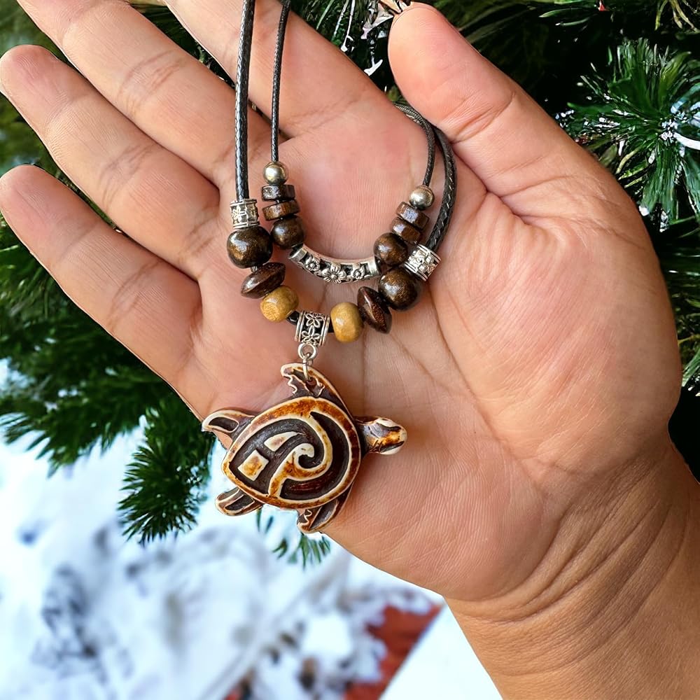 قلادة سلحفاة قبلية بنية اللون - قلادة سلحفاة هاواي - مطرزة بالخشب بحبل أسود قابل للتعديل