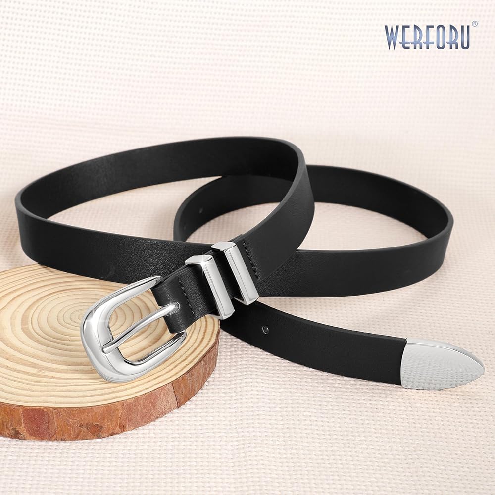 حزام جلد نسائي من WERFORU حزام خصر جلدي أنيق للسراويل الجينز للسيدات حزام غربي رفيع مع إبزيم ذهبي/فضي (يناسب مقاس الخصر 26 بوصة - 30 بوصة، إبزيم أسود فضي