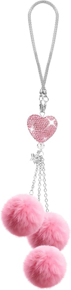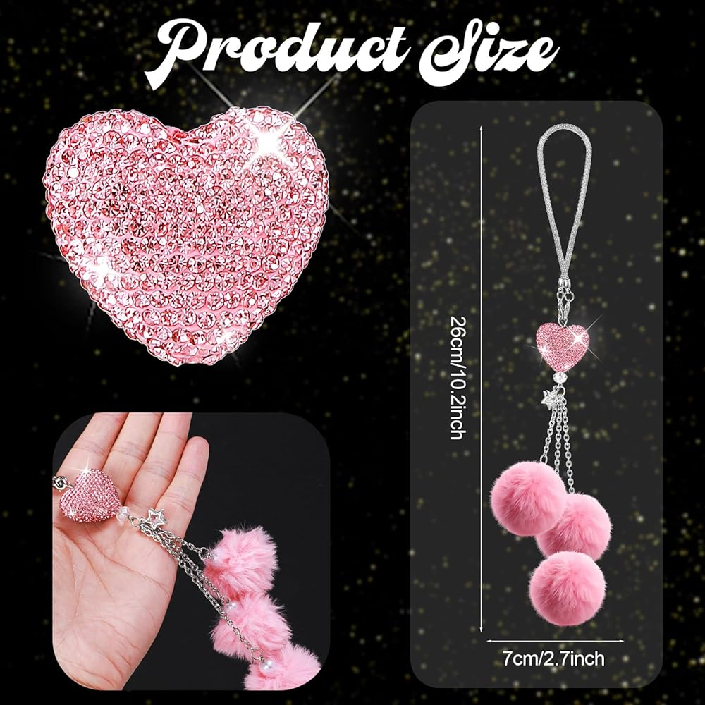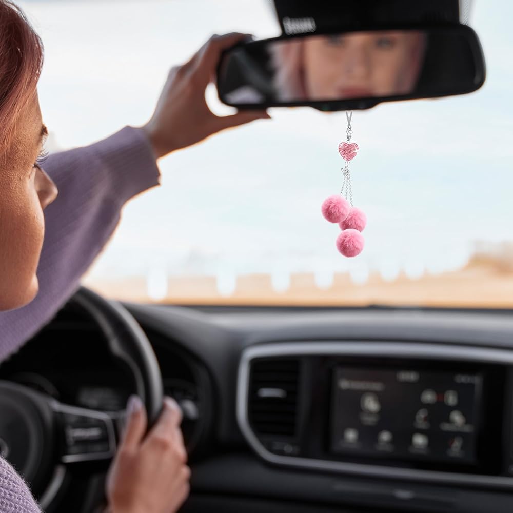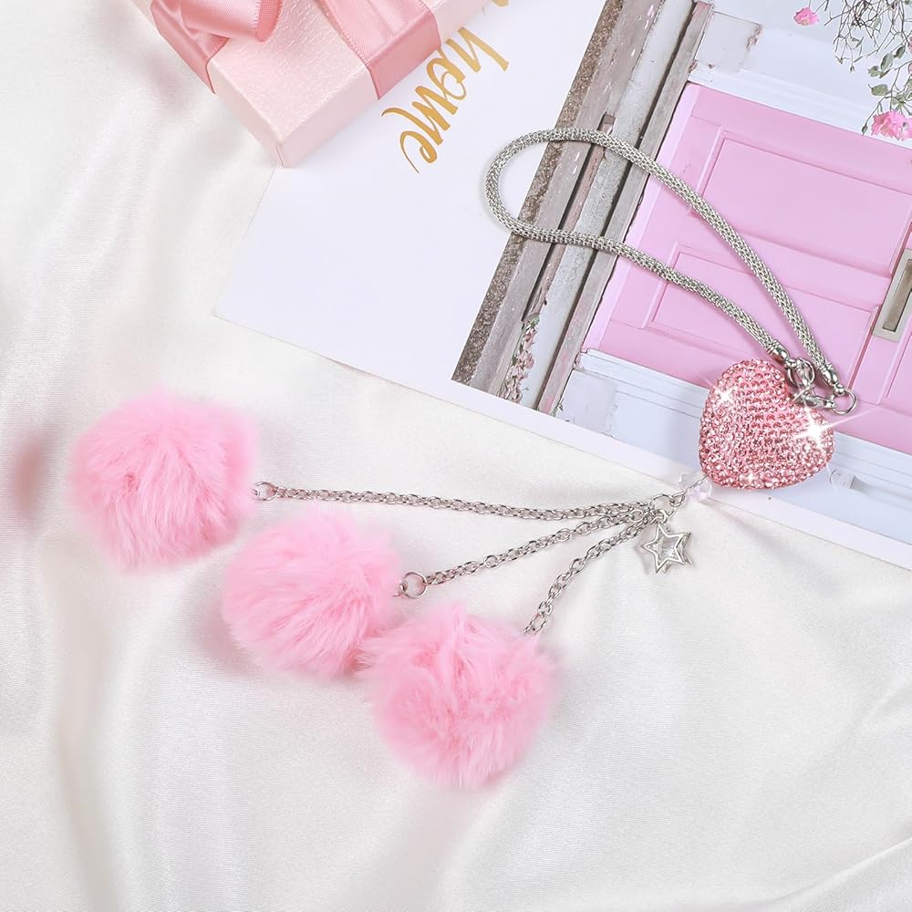 Car Charms for Rear View Mirror: Enhance your car's interior with these dazzling car charms. Featuring a Love Heart and Pink Plush Ball design, these bling car accessories for women add a touch of sparkle and elegance to your ride. Ideal for those who love a bit of glamour!