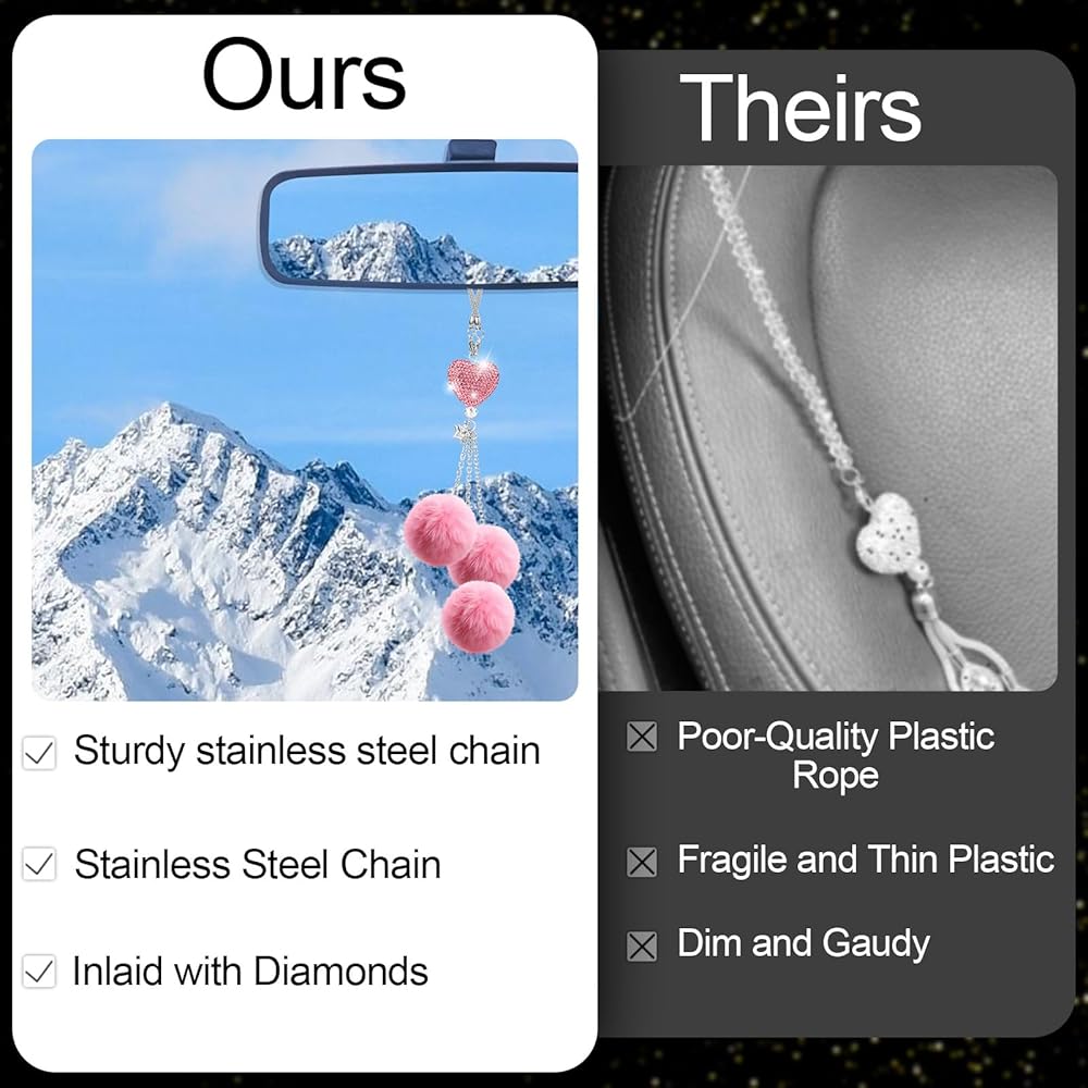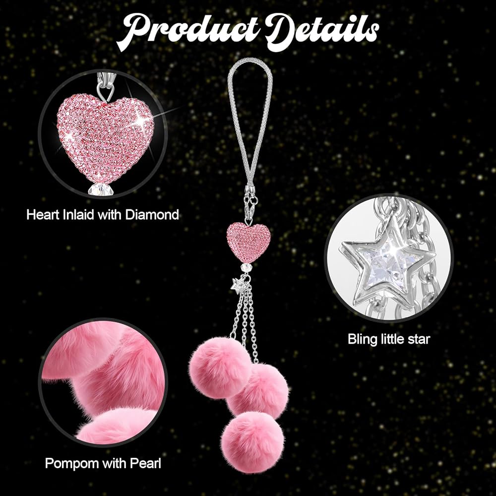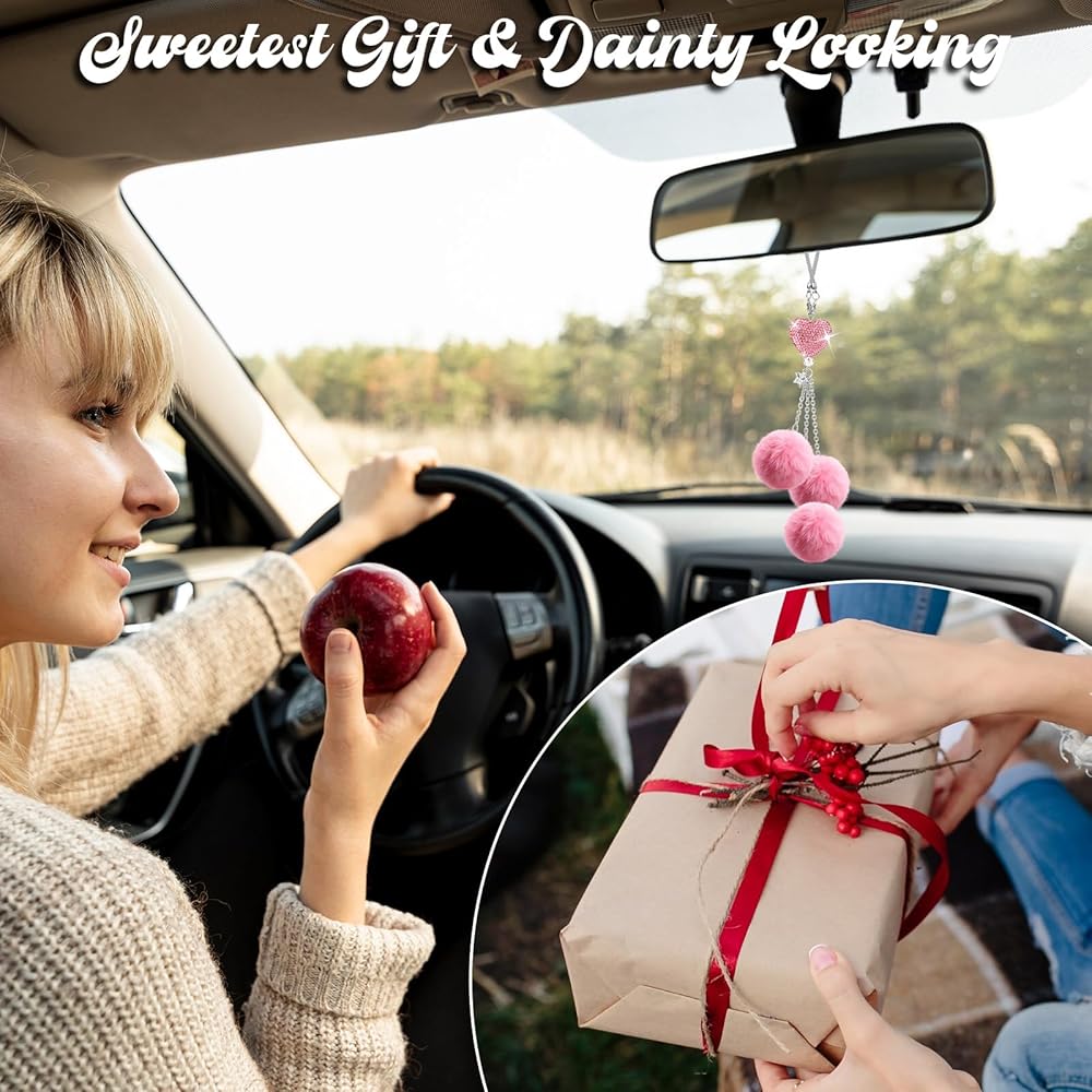Perfect Gift: Surprise your loved ones with these adorable car charms for rear view mirror. Packaged in a beautiful gift box, these bling car accessories for women are ready to be given on any occasion. Spread joy and positivity with these charming Love Heart and Pink Plush Ball decor pieces!