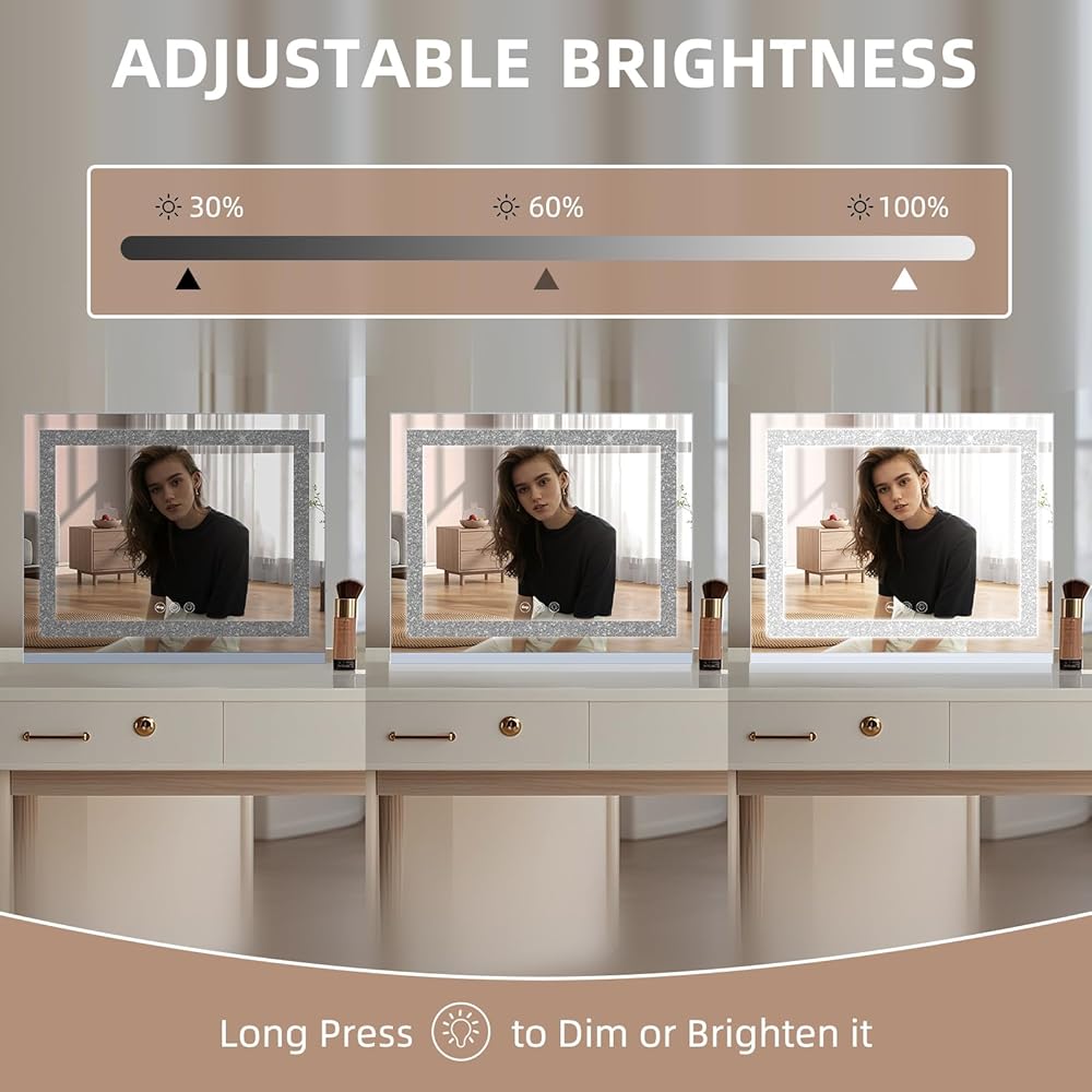 3 أضواء ألوان وسطوع قابل للتعديل: تحتوي المرآة المضيئة على ثلاثة إعدادات ألوان، ضوء دافئ 3000 كلفن، ضوء طبيعي 4500 كلفن وضوء بارد 7000 كلفن، يمكن تعديل السطوع من 10% إلى 100%. يوفر شريط إضاءة LED إضاءة ساطعة تدوم طويلاً، وهو ملائم للغاية لوضع المكياج في الليل أو الإضاءة الداخلية المنخفضة