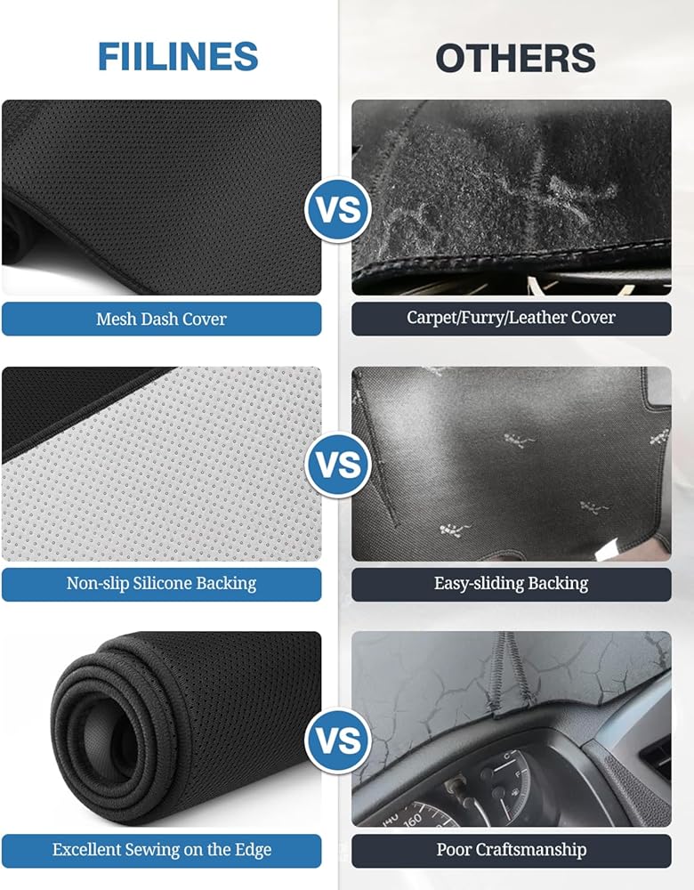 مادة مسامية مطورة: غطاء لوحة القيادة الخاص بنا مصنوع من مادة نسيج شبكية؛ بالمقارنة مع سجادات غطاء لوحة القيادة من السجاد/الفراء/الجلد، فإن غطاء لوحة القيادة هذا أكثر مسامية؛ تتمتع سجادة لوحة القيادة بحماية جيدة من أشعة الشمس وعزل حراري؛ حافظ على لوحة القيادة في حالة ممتازة بغض النظر عن الموسم