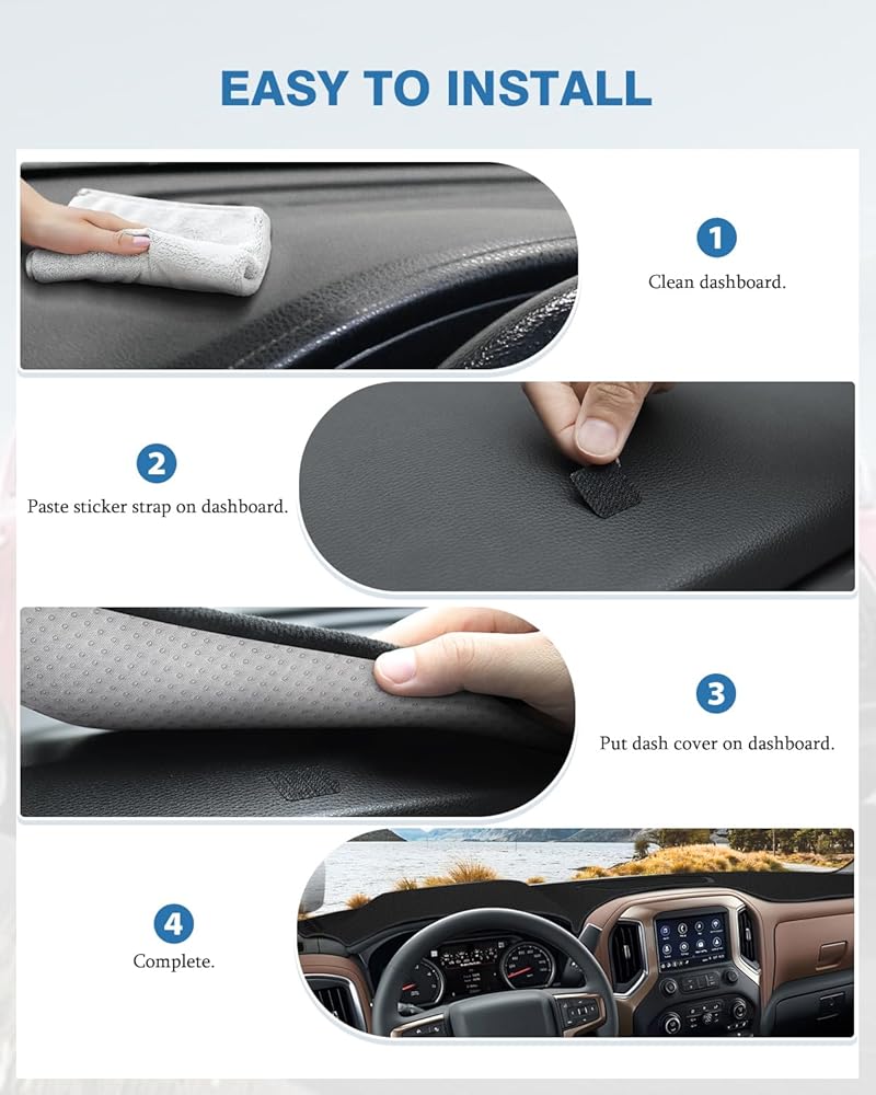 قم بالتركيب في دقائق: نظف سطح لوحة أجهزة القياس الخاصة بسيارتك، ثم ضع غطاء لوحة أجهزة القياس على لوحة أجهزة القياس الخاصة بك؛ تأتي العبوة مع العديد من أدوات التثبيت لمساعدتك على جعلها أكثر ثباتًا؛ سهل التركيب والإزالة