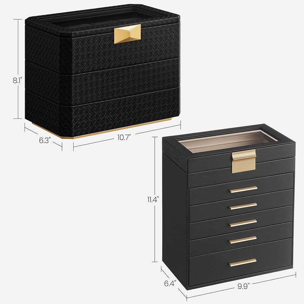 【تخزين، 6 طبقات】حافظ على جميع مجوهراتك منظمة في صندوق المجوهرات هذا - تدخل القطع الصغيرة من المجوهرات في الفتحات المختلفة للطبقات الخمس العلوية، وتوضع النظارات الشمسية والساعات في الدرج السفلي الكبير.